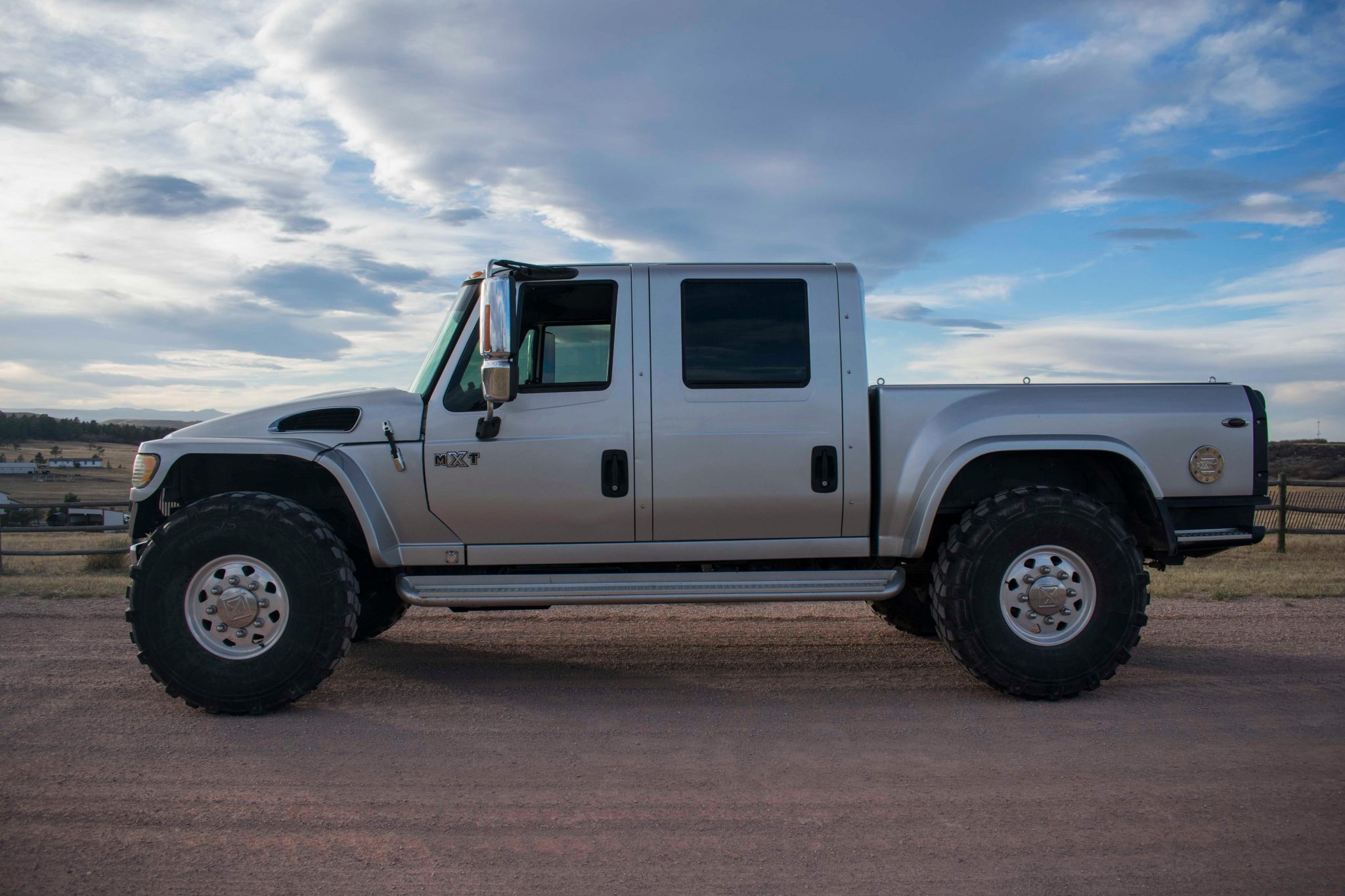 Polished 20″ eight-lug wheels are mounted with 395/85 Michelin tires. The seller notes cracking on the sidewalls, and stopping power is provided by hydraulic brakes with four-channel ABS.