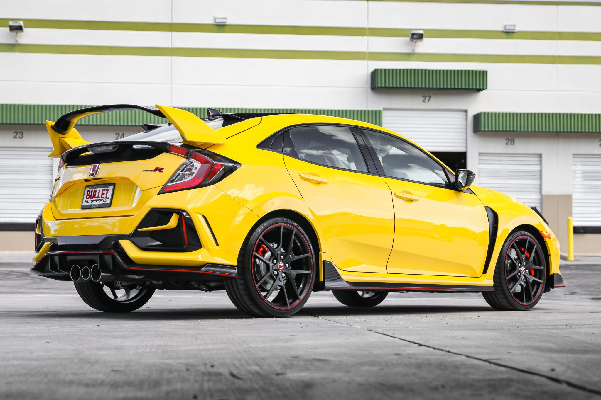 Matte black-finished 20″ forged BBS wheels are mounted with 245/30 Michelin Pilot Sport Cup 2 tires, and stopping power is provided by four-wheel disc brakes with red-painted four-piston Brembo calipers up front. The Type R suspension features stiffer springs, bushings, and anti-roll bars compared to the base Civic, and the suspension and steering systems were recalibrated for the Limited Edition.
