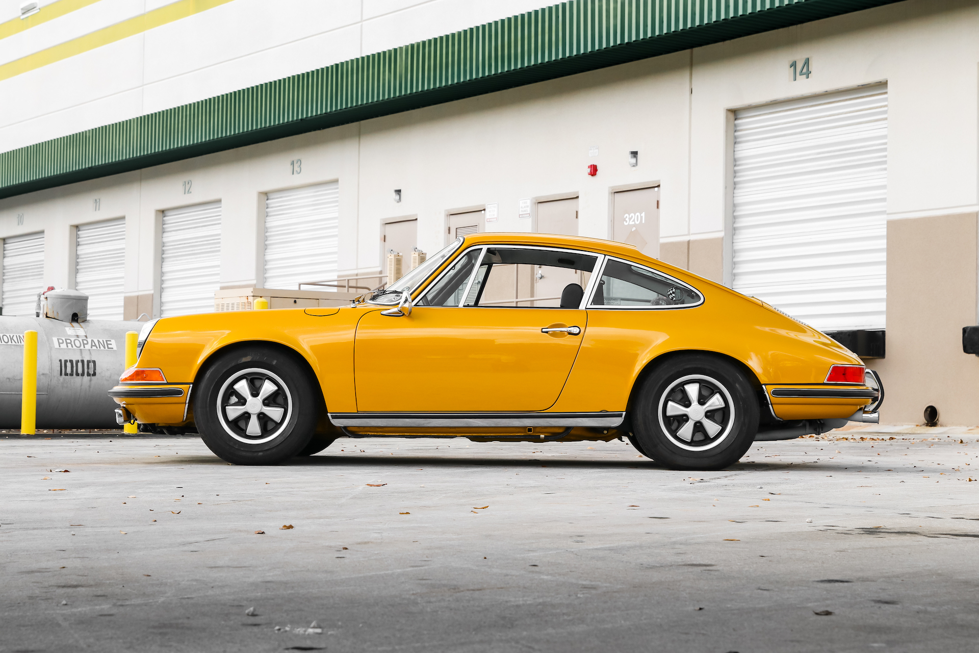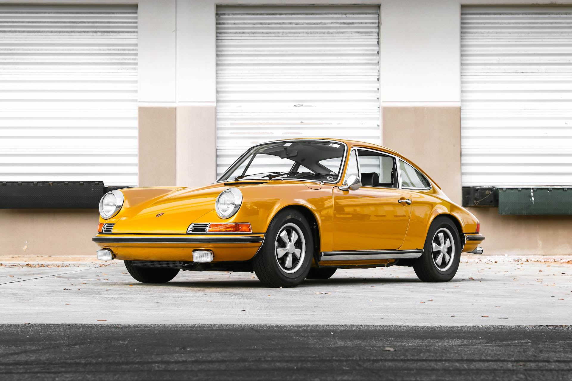 Refurbished 14″ Fuchs wheels wear Vredestein Sprint Classic tires. The 911E was equipped from the factory with self-leveling hydropneumatic front struts, and this example is fitted with Bilstein shocks out back. Braking is provided by discs at each corner.