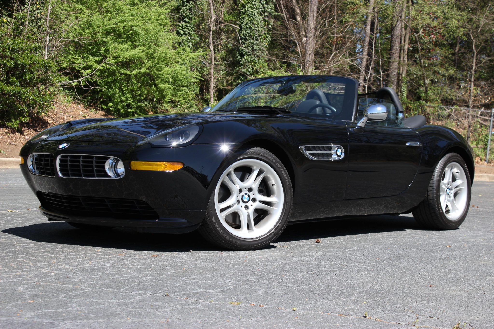 Split-spoke 18″ forged wheels wear Bridgestone Potenza RE040 tires measuring 245/45 up front and 275/40 out back, and standard equipment includes aluminum suspension components, Dynamic Stability Control (DSC), Dynamic Brake Control (DBC), and All-Season Traction (AST). The body-colored removable hardtop comes with a fitted top cover and a top storage stand as well as a snap-in wind deflector that fits between the twin roll hoops.