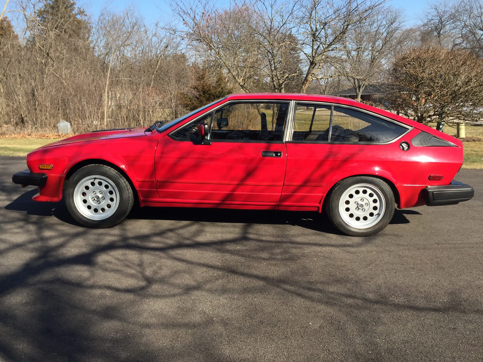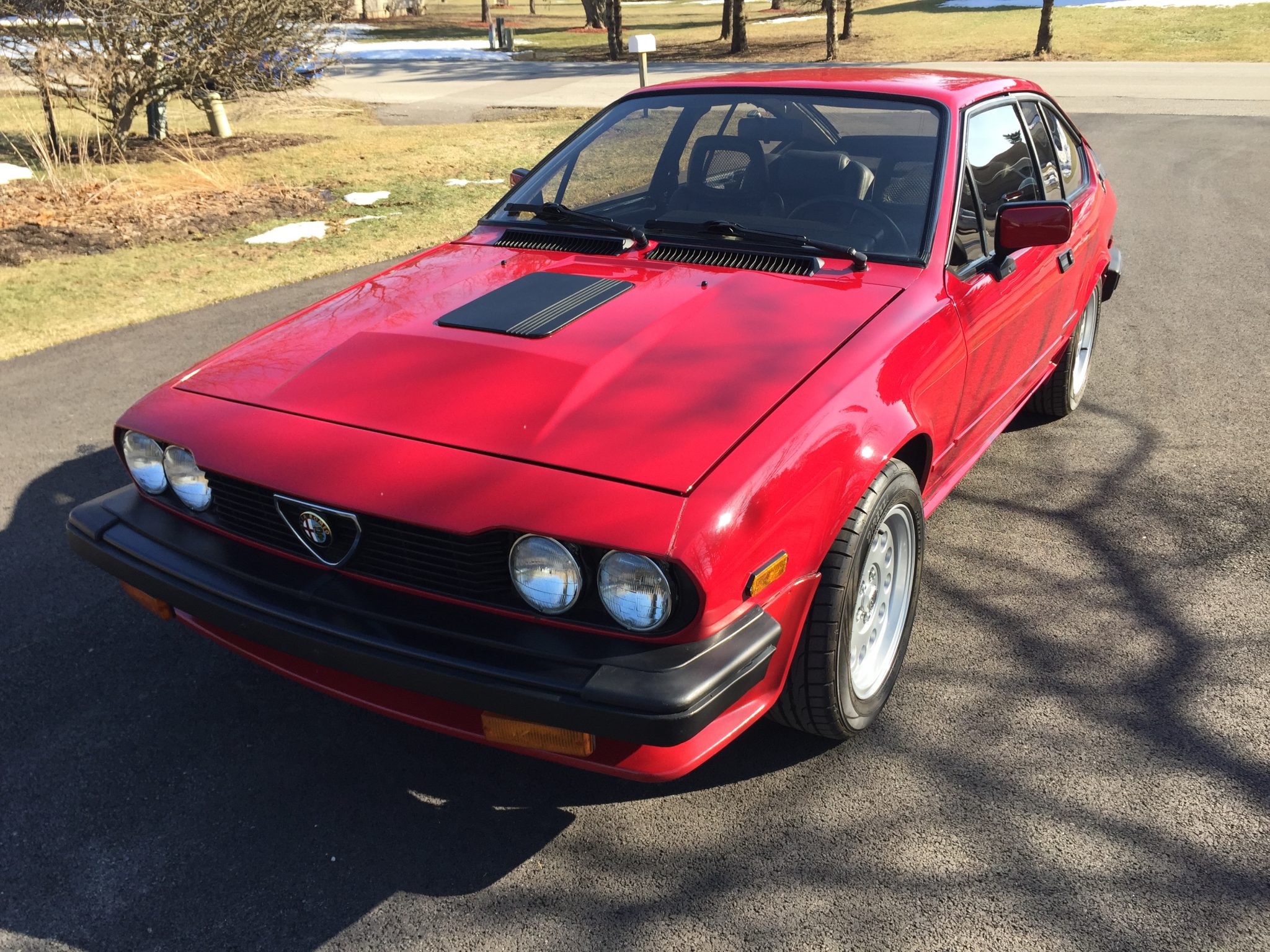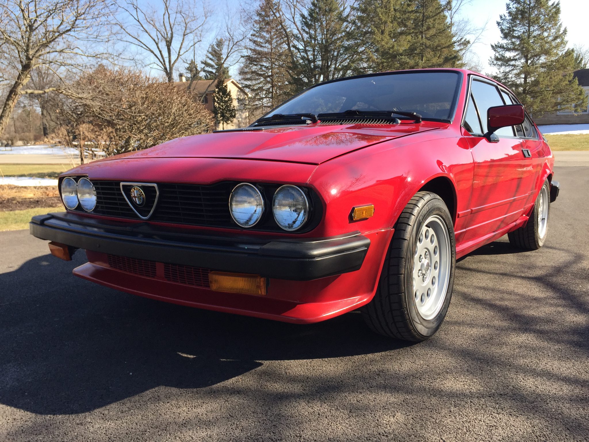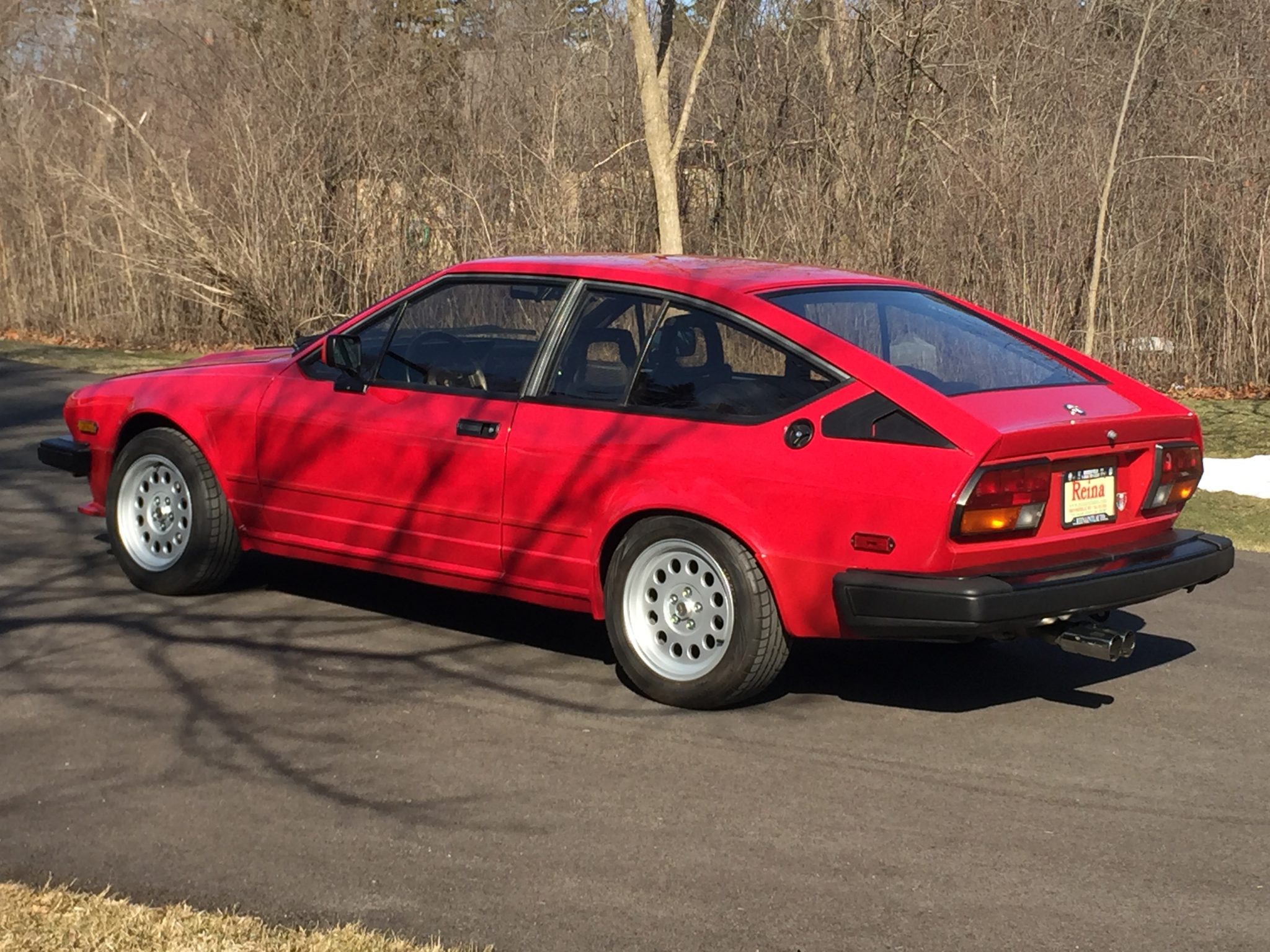 The 15” 13-hole Ronal wheels wear Alfa Romeo centers and are mounted with 205/55 Dunlop Direzza DZ102 tires. The seller notes that the suspension bushings have been replaced and that the de Dion rear end was removed and powder coated under current ownership. Bilstein shocks have been fitted, and an additional set of Ronal five-spoke wheels are included in the sale. The seller reports spots of oxidation on suspension components.