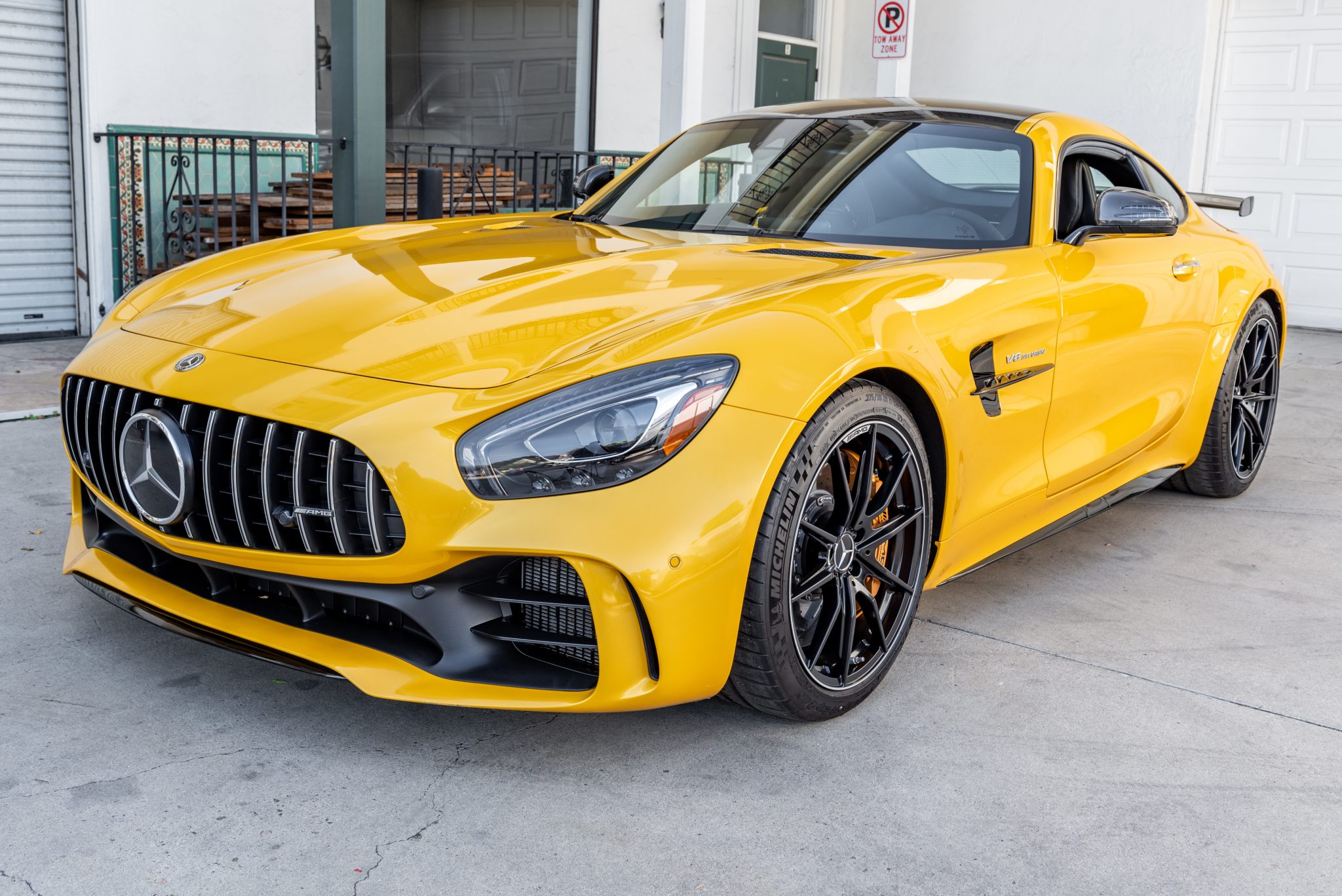 Staggered-diameter 19″ and 20″ forged AMG wheels wear a black finish and are mounted with 275/35 front and 325/30 rear Michelin Pilot Sport Cup 2 tires. The carbon-ceramic brake system utilizes gold-finished calipers and cross-drilled rotors at each corner. The car is also equipped with rear-axle steering and an adaptive AMG Sport suspension.