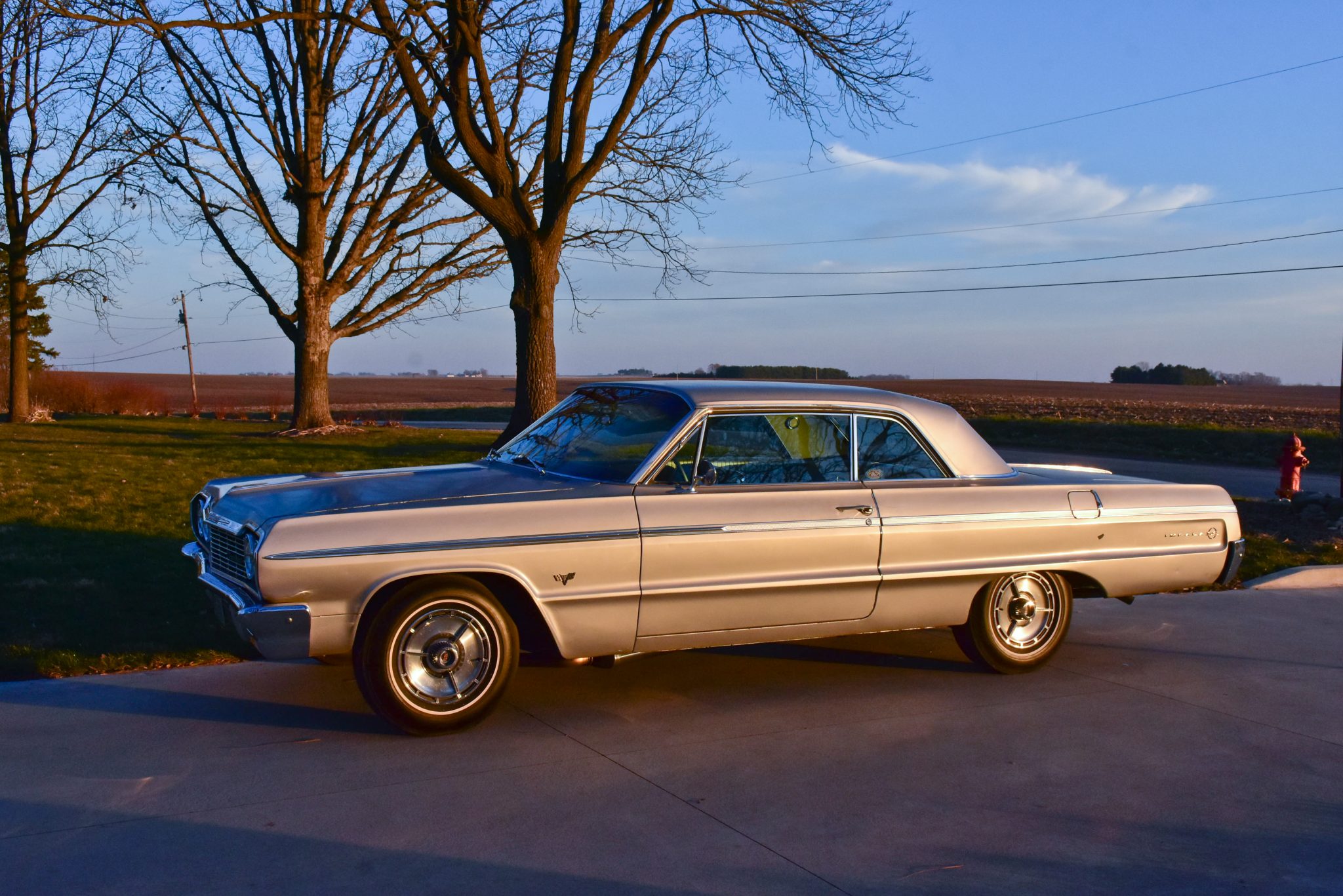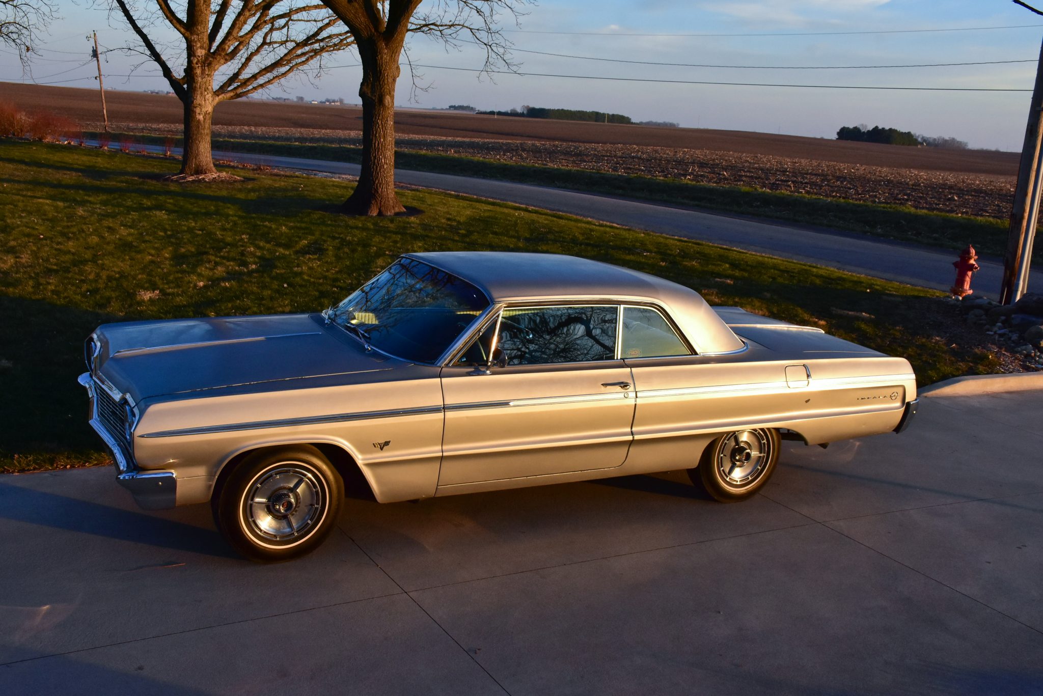 Steel wheels wear SS-branded covers and whitewall bias-ply tires that the seller recommends replacing due to age. The car is equipped with twin stabilizer arms on the rear axle.