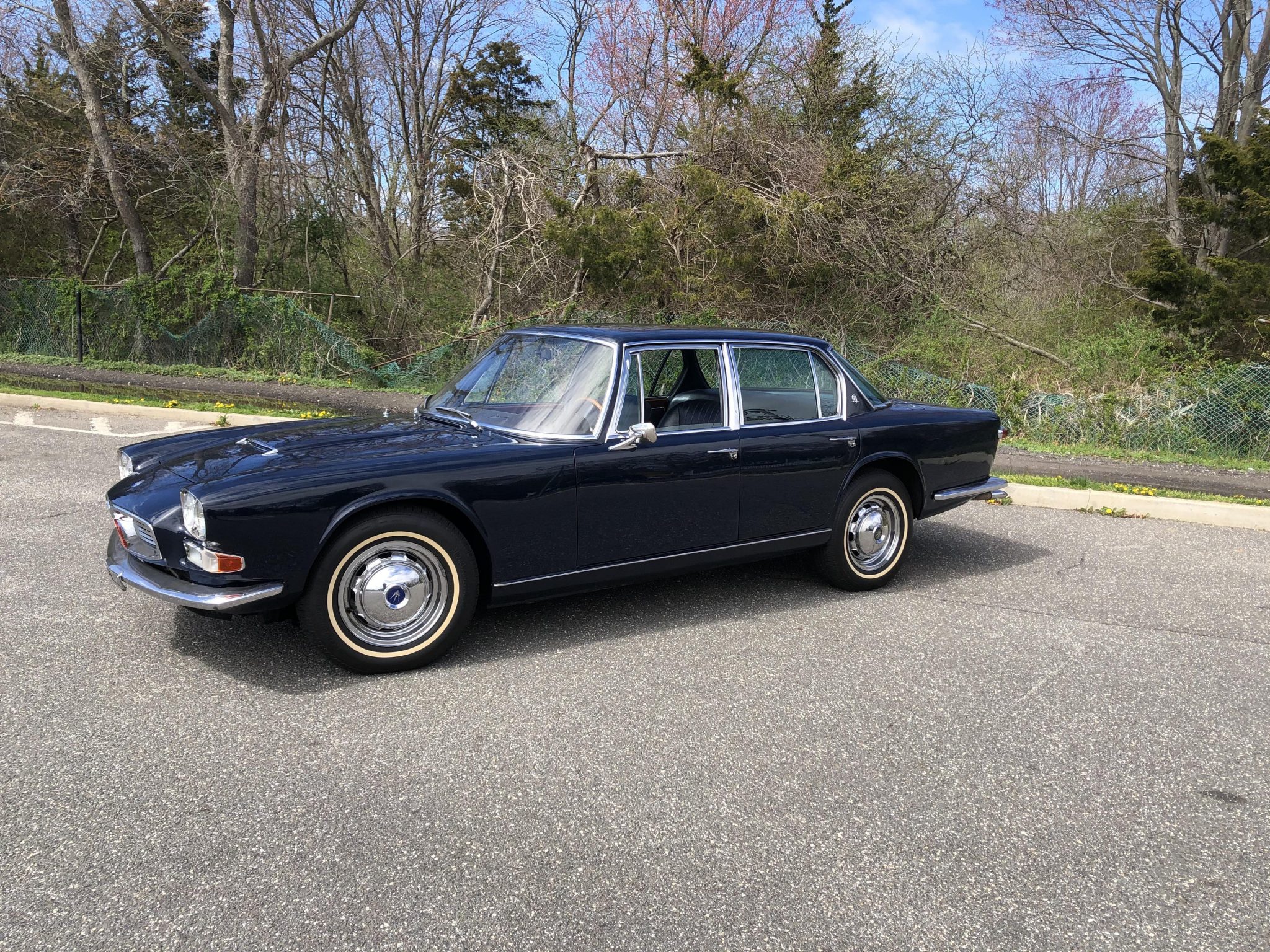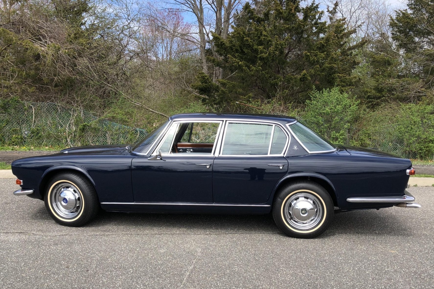 Polished steel 15” wheels feature Maserati-branded hubcaps and are wrapped in Prestige Radialmax white-stripe tires sized 215/75. Stopping power is provided by Girling four-wheel discs, and the car rides on independent front suspension. A full-size spare is found in the trunk. Peeling is noted on the wheels and hubcaps, and creases on two of the tires are visible in the gallery.