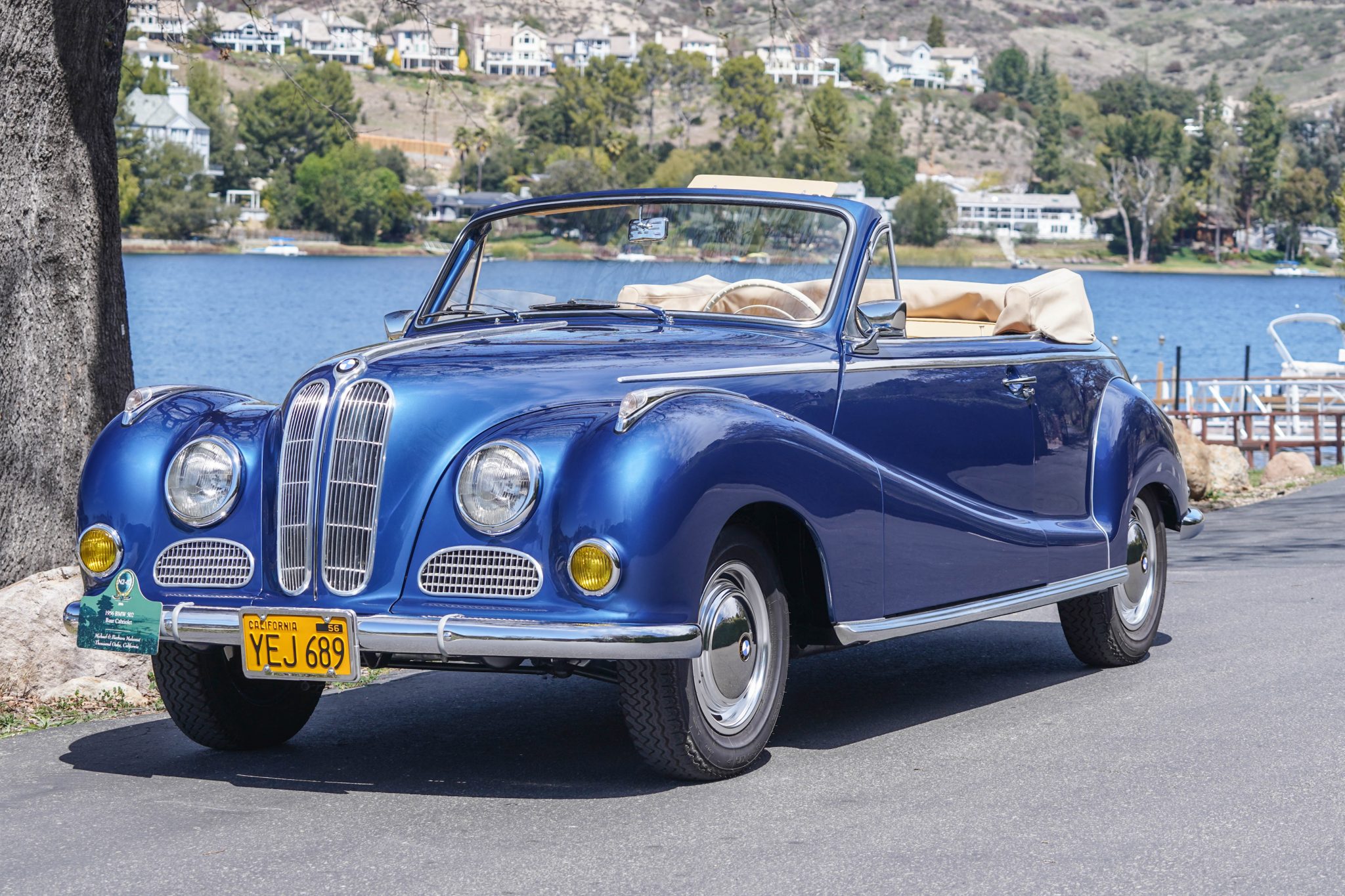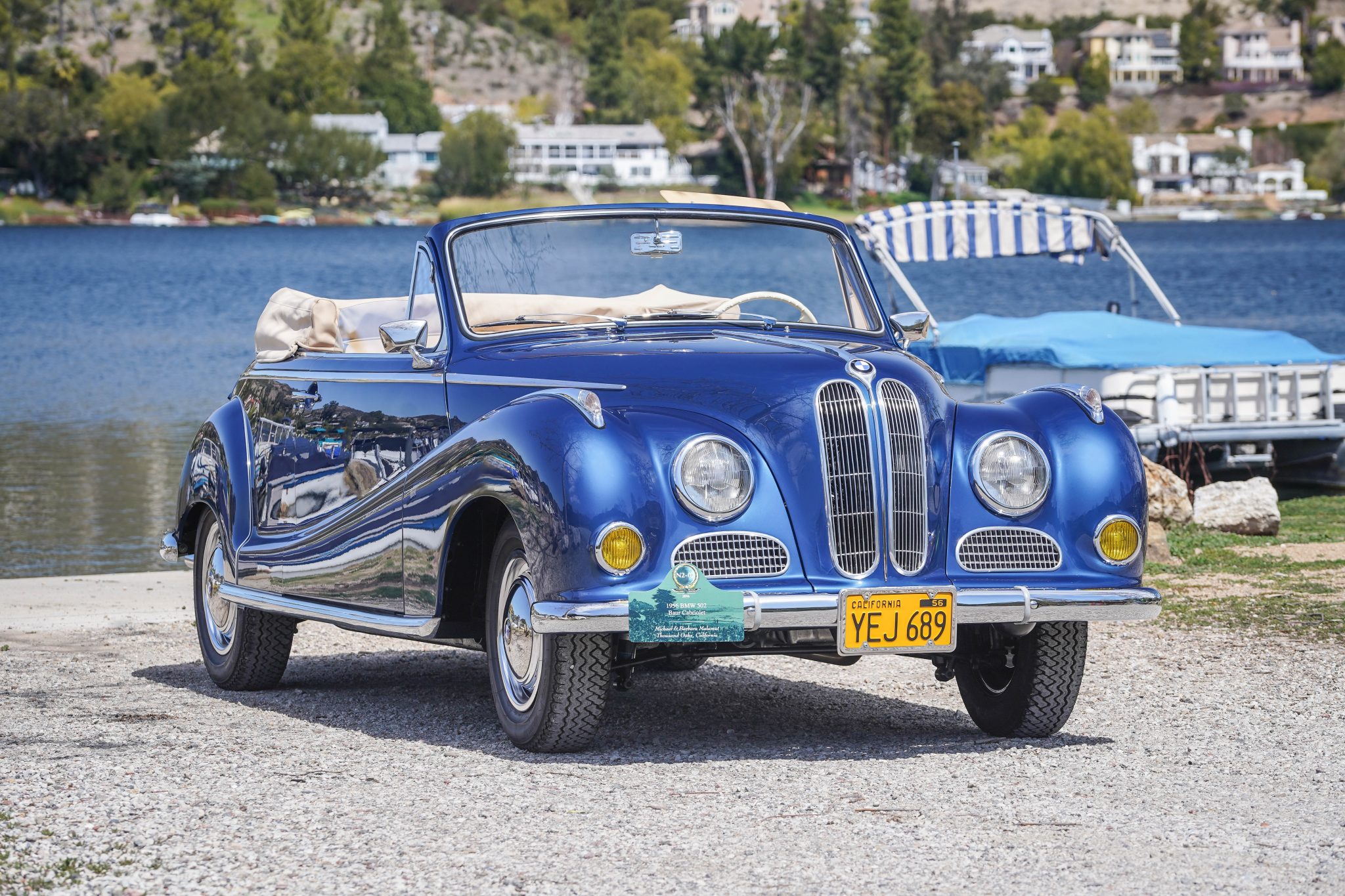 Originally finished in Cortina Grey, this example was sandblasted and underwent rust repair with section of new steel before being refinished in the BMW hue of Topaz Blue Metallic (364). The brightwork was replated or replaced, and a new windshield, body seals, and fog lamps were fitted. The convertible top frame was refurbished and draped in new beige canvas with a vinyl rear window. Additional features include radially-retracting rear quarter windows and a factory-optional windshield washer system. The seller notes that the pictured yellow California license plates are included in the sale, but are not assigned to the car.