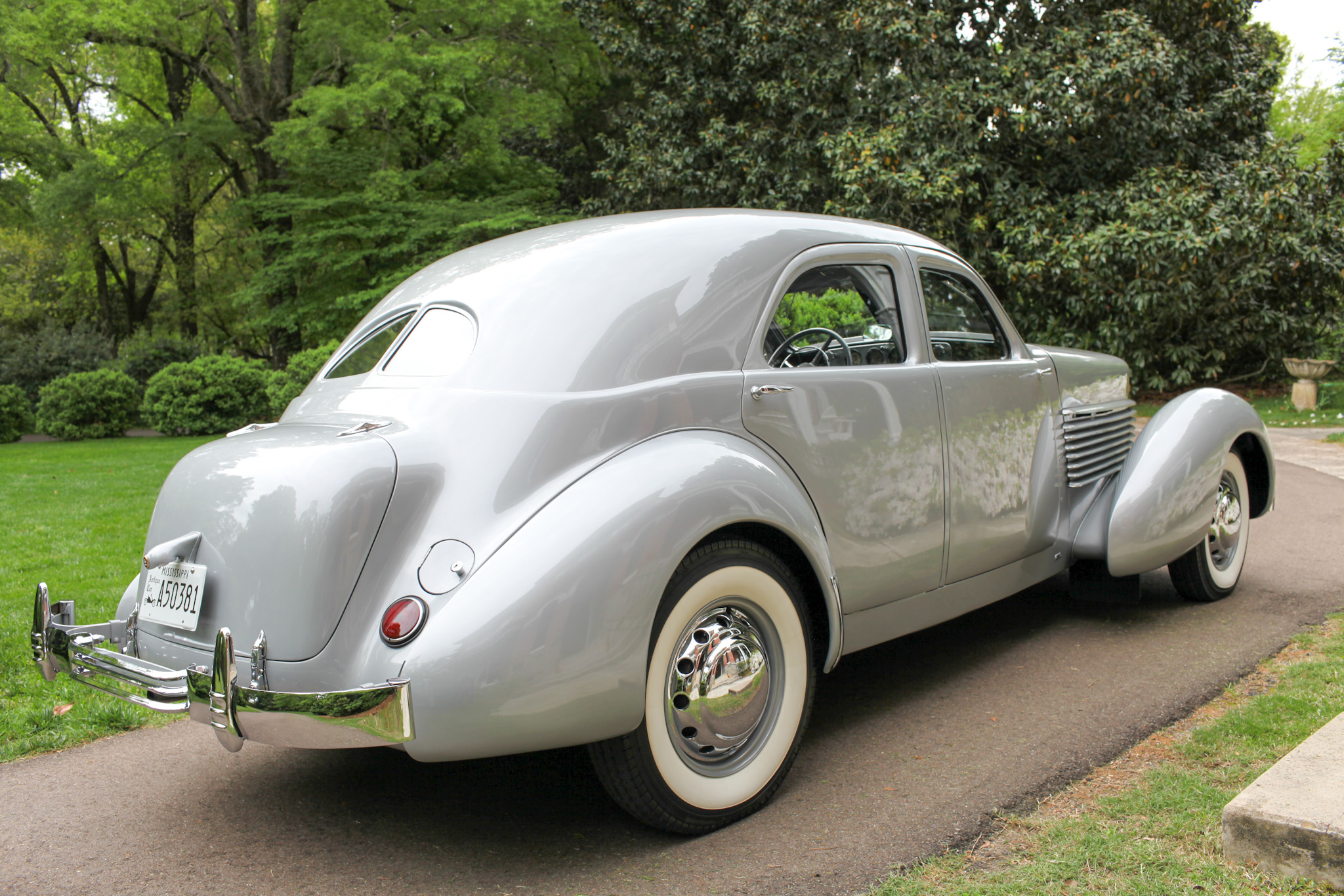 This example is said to have been repainted in its current gray under Mr. Baker’s ownership. Features include pontoon fenders, pop-up headlights, and a spilt rear window. The model can also be differentiated by its eight hood louvers, compared to seven on standard 810/812s. Cracks in the paint are noted around the right headlight cover.
