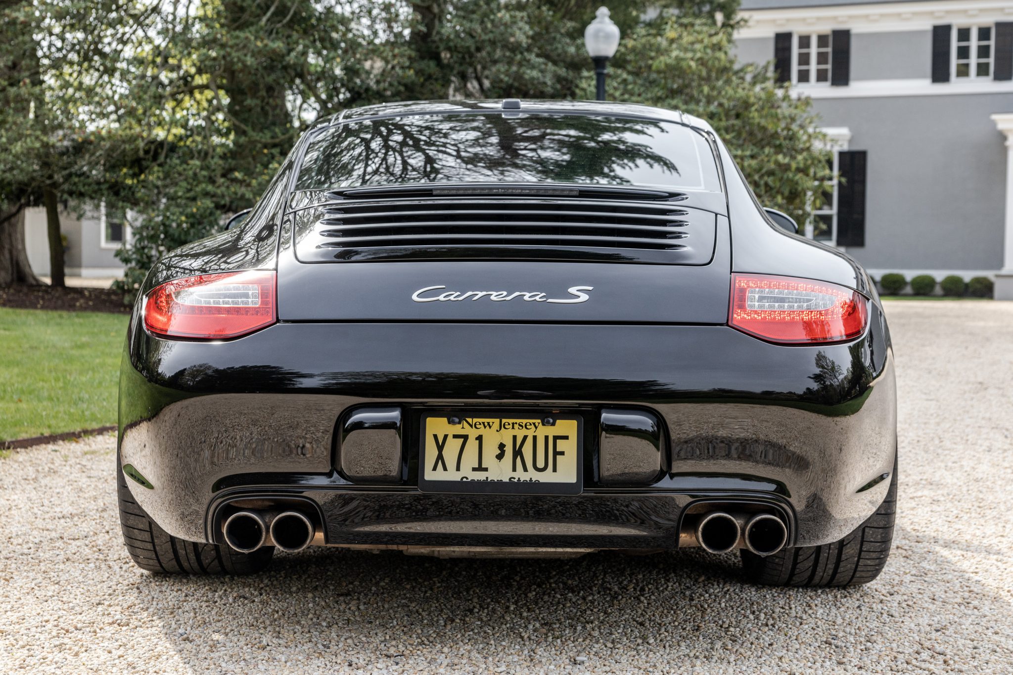 Five-spoke 19″ black-finished wheels are wrapped in staggered-width Bridgestone Potenza RE050A tires that show date codes from 2015 and 2016. Stopping power is from red-painted Porsche-branded calipers and cross-drilled rotors at all four corners.
