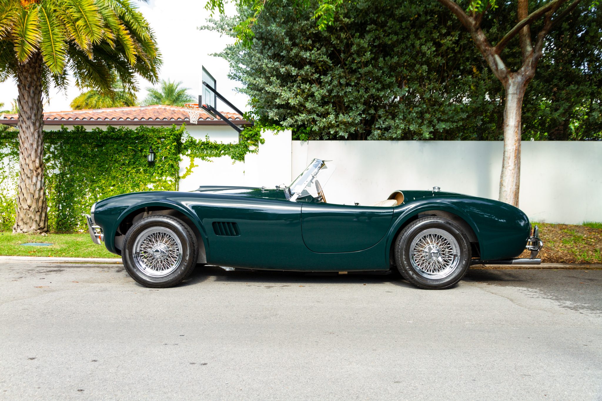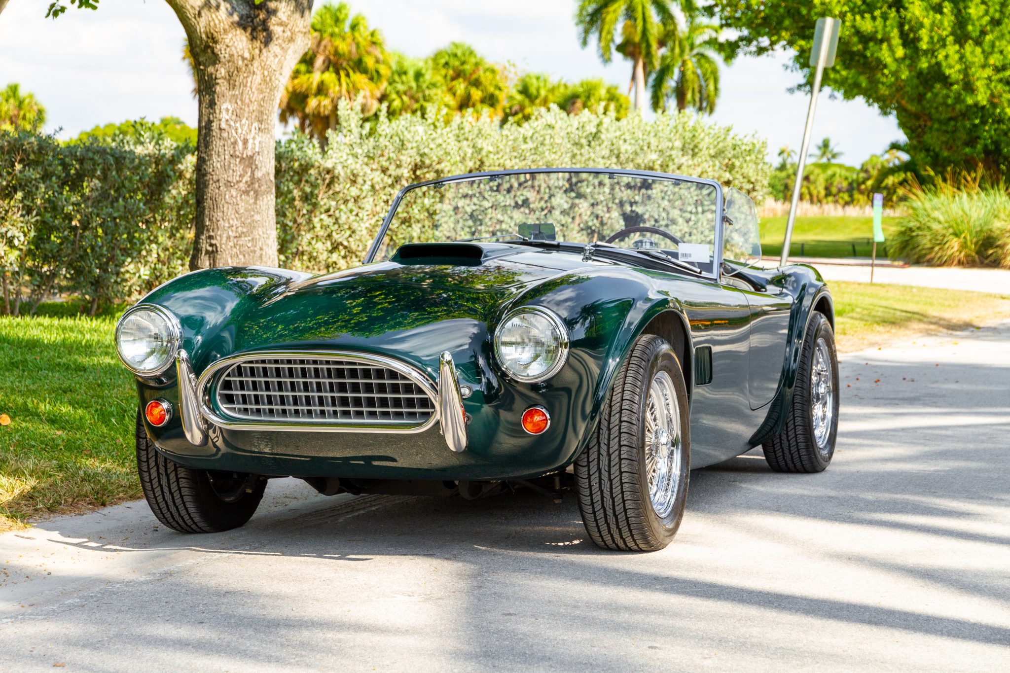 Chrome 15″ wire wheels feature winged knockoffs and wear 205/60 Dunlop Signature II tires showing 2015 date codes. Wilwood disc brakes are mounted at all four corners.