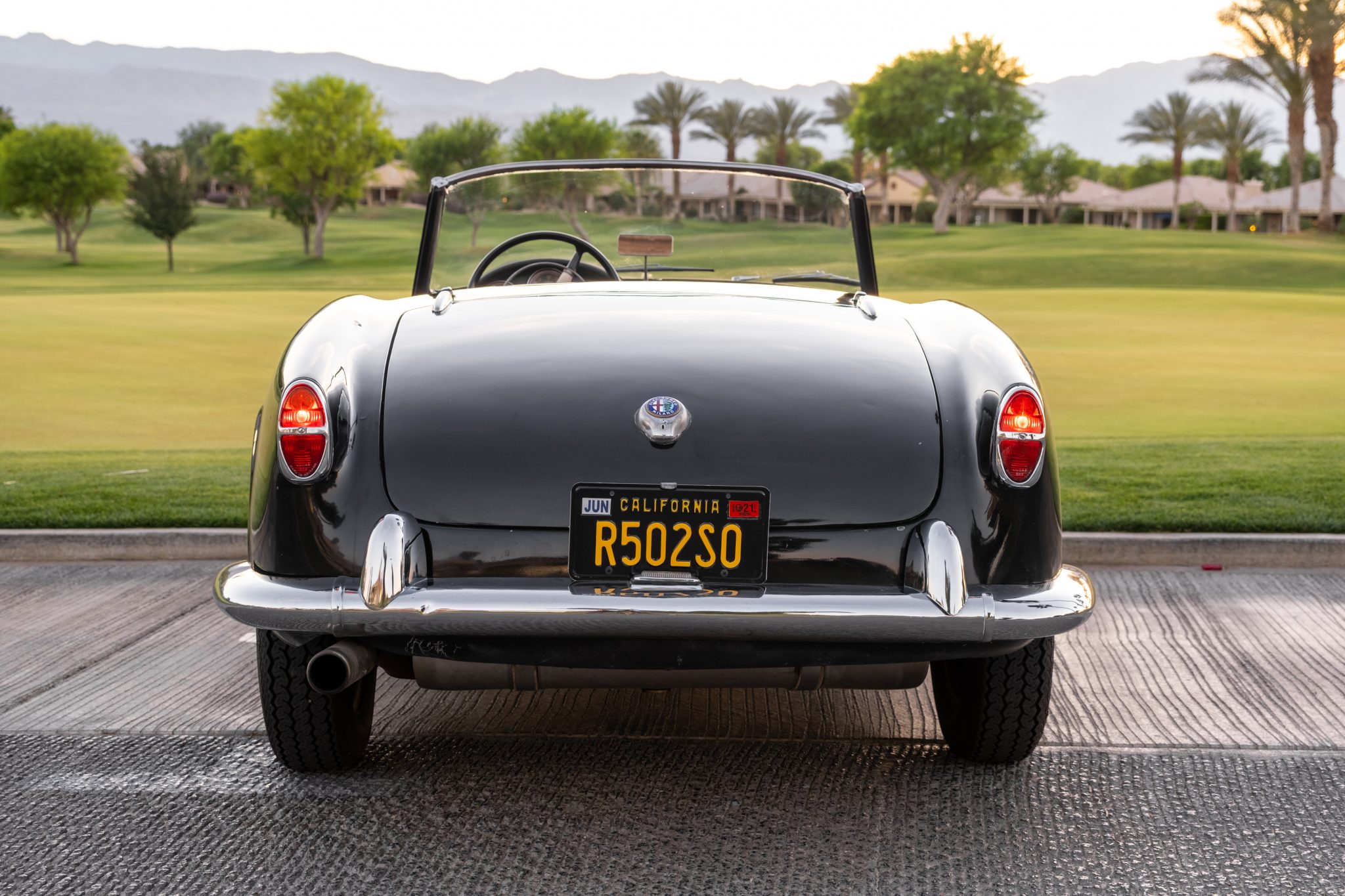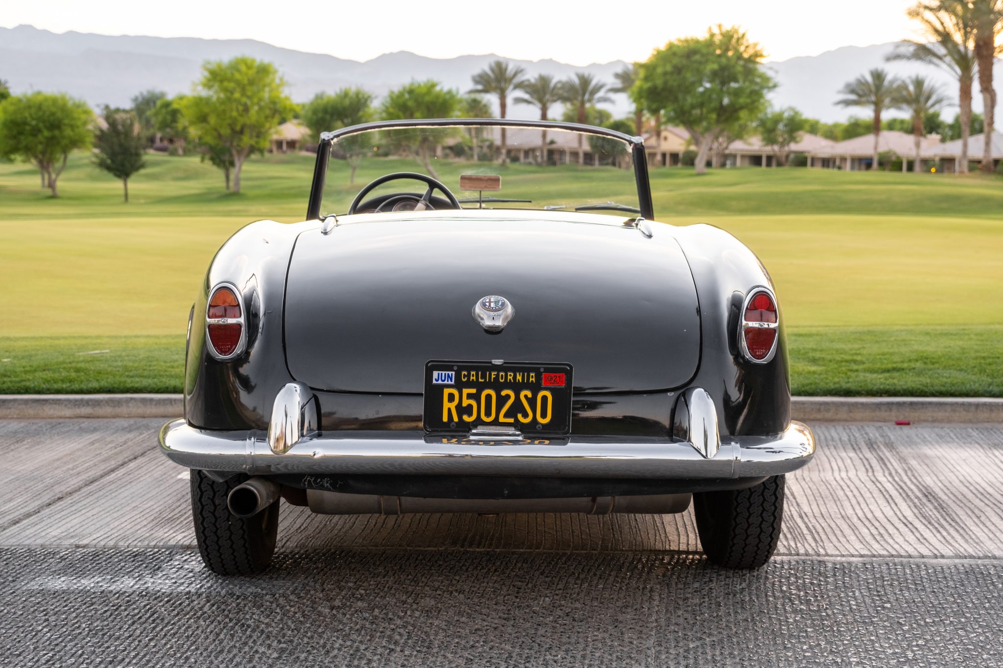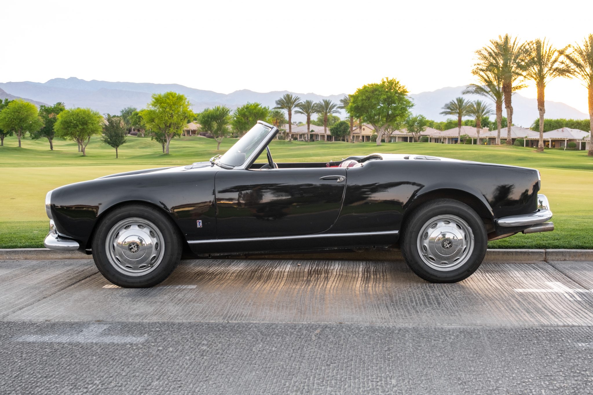 Borrani steel wheels wear Alfa Romeo-crest hubcaps and 15″ Vredestein Sprint classic tires bearing 2018 date codes. Braking is handled by four-wheel drums, and the system was serviced by the seller with a replacement master cylinder, front wheel cylinders, and soft and hard line replacements.