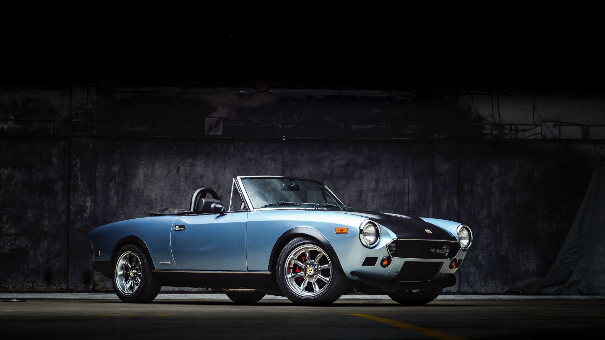 Aftermarket 15″ Panasport-style wheels measure 7.5″ wide and are wrapped in 205/50 Dunlop Direzza DZ101 tires. The suspension is fitted with Koni shocks and springs. Larger front brakes from a modern Fiat 500 have been added along with rear discs in place of the factory drums.