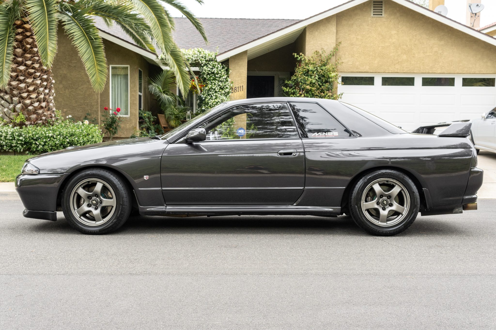 Factory 16” five-spoke alloy wheels are mounted with 225/50 Bridgestone Potenza Adrenalin RE002 tires. The car came factory-equipped with HICAS four-wheel steering, and suspension and braking modifications include HKS Hypermax II coilovers, Project Mu disc brakes, and Hawk HPS brake pads at all four corners.