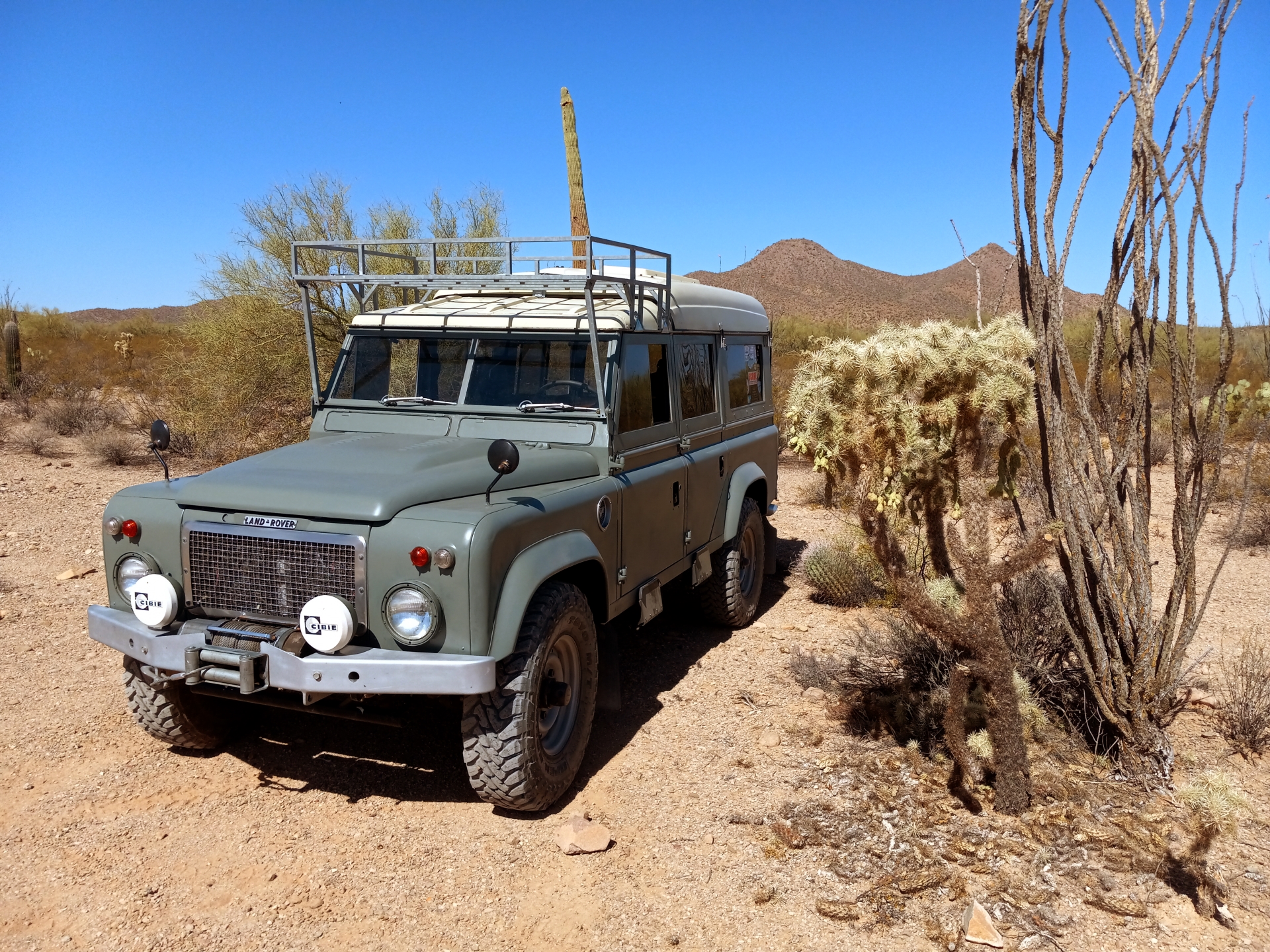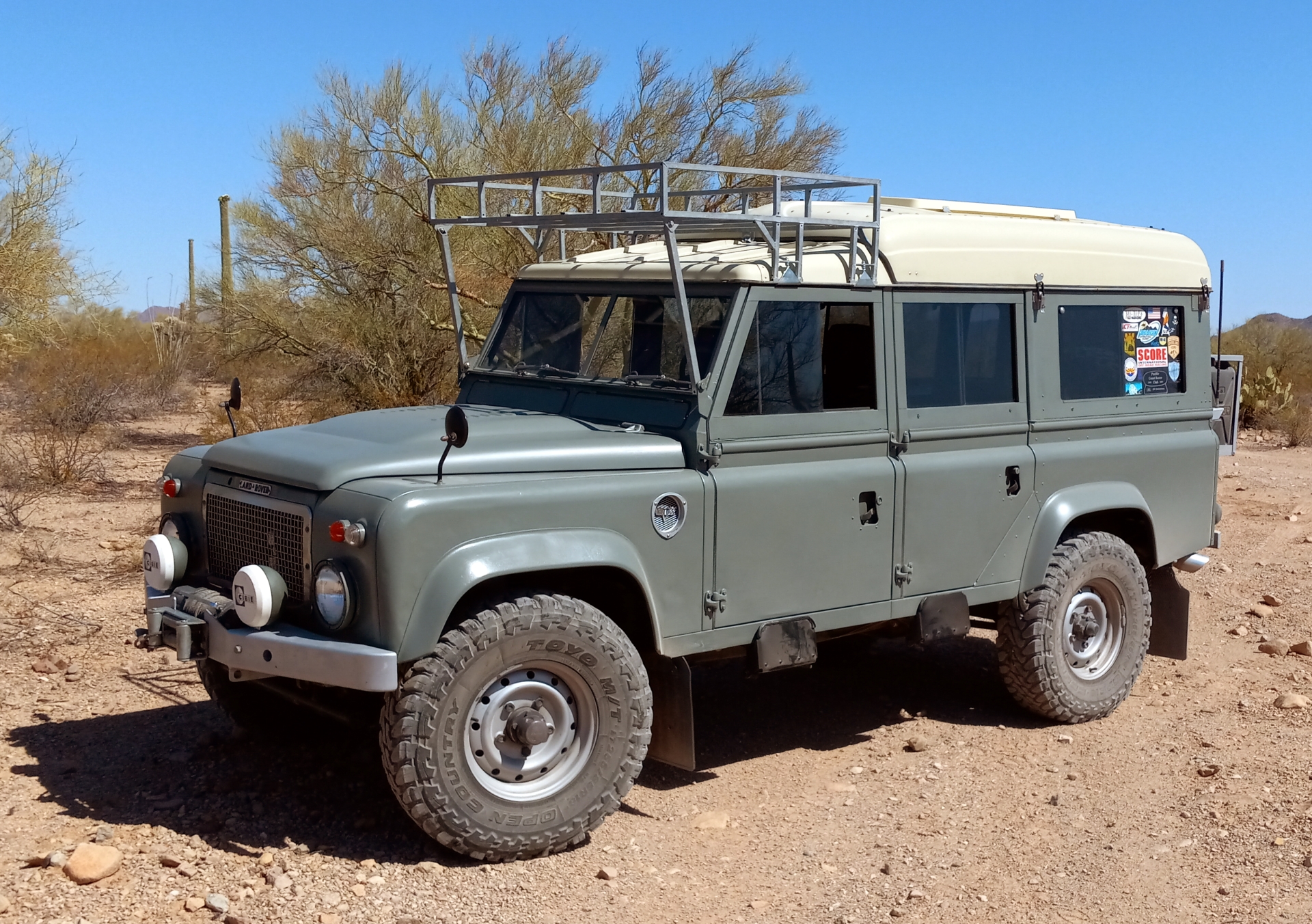 Silver-finished 16″ steel wheels wear 255/85 Toyo Open Country M/T tires, and a matching spare fitted with a BFGoodrich Mud Terrain T/A KM2 tire is mounted to a rear swing-away carrier that also houses a pair of jerry cans. Ventilated Disc brakes sourced from a Range Rover Classic are fitted up front, and Defender-specification disc components are utilized out back. Additional updates include a power steering system consisting of a Range Rover Classic steering gearbox and GM pump.