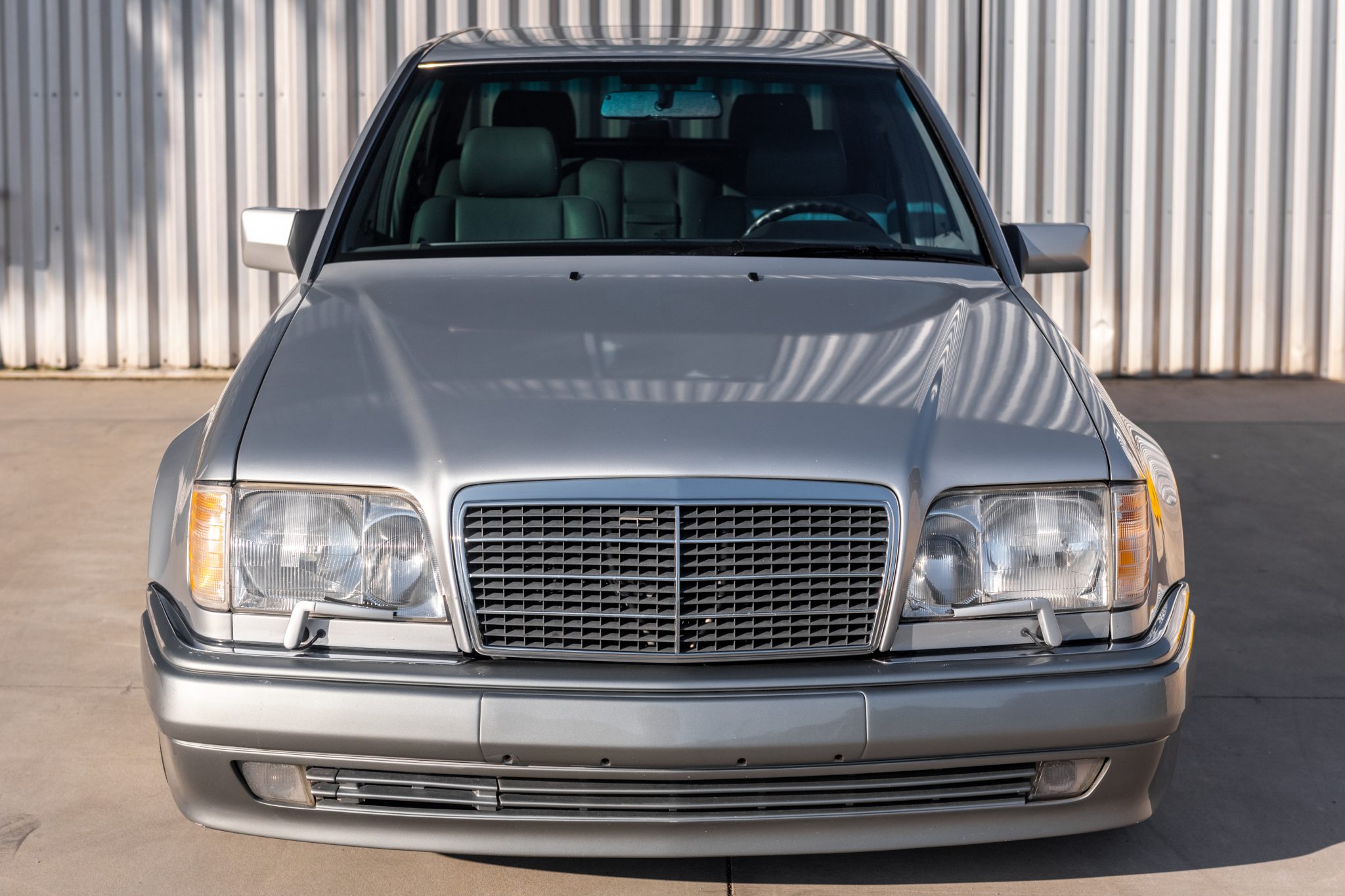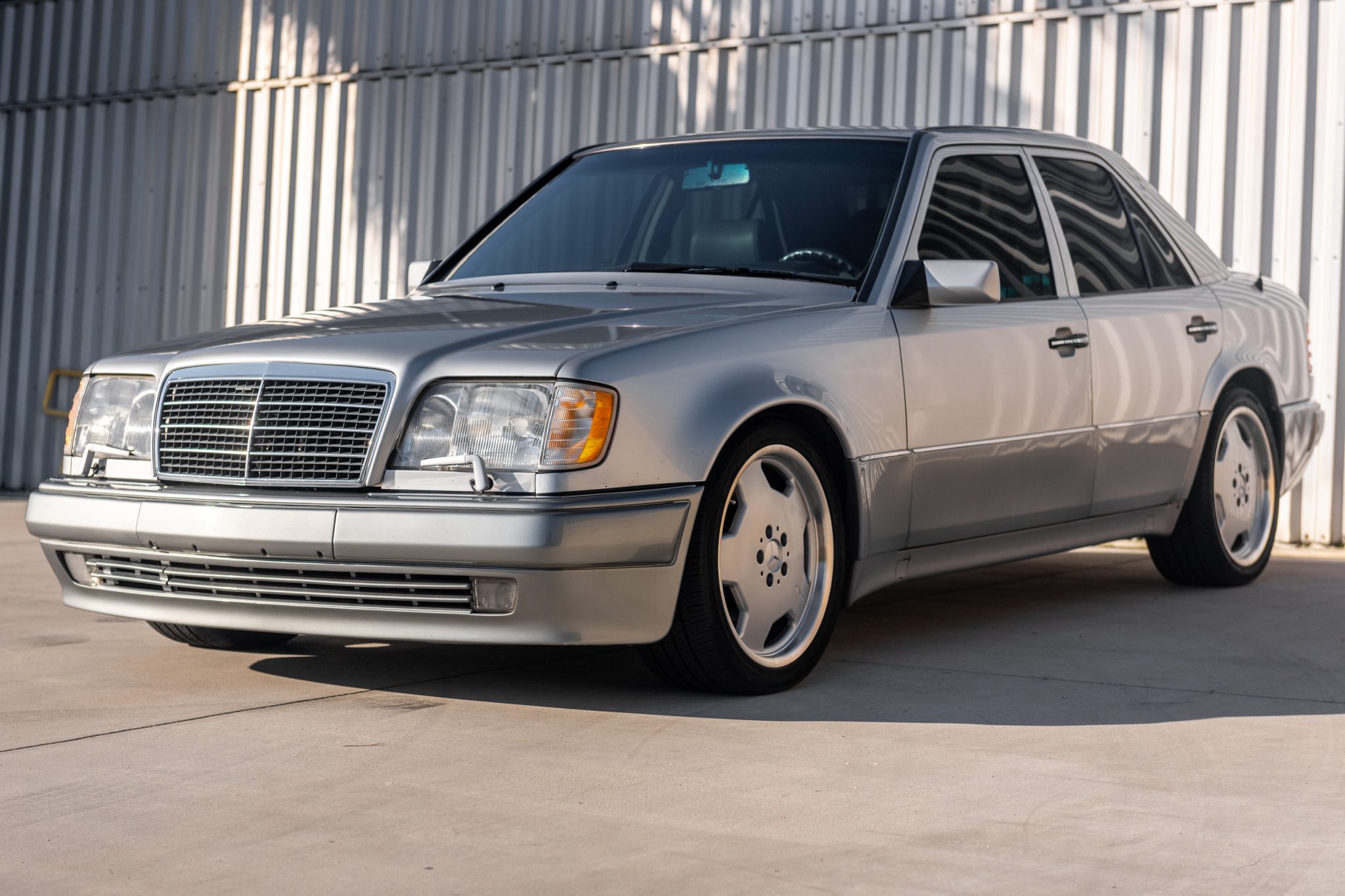 AMG Monoblock 18″ wheels are wrapped in Nexen tires measuring 245/40 all around. Distinguishing features of the 500E compared with other W124 models included a wider track width, flared fender arches, larger four-wheel disc brakes, and a revised front air dam.