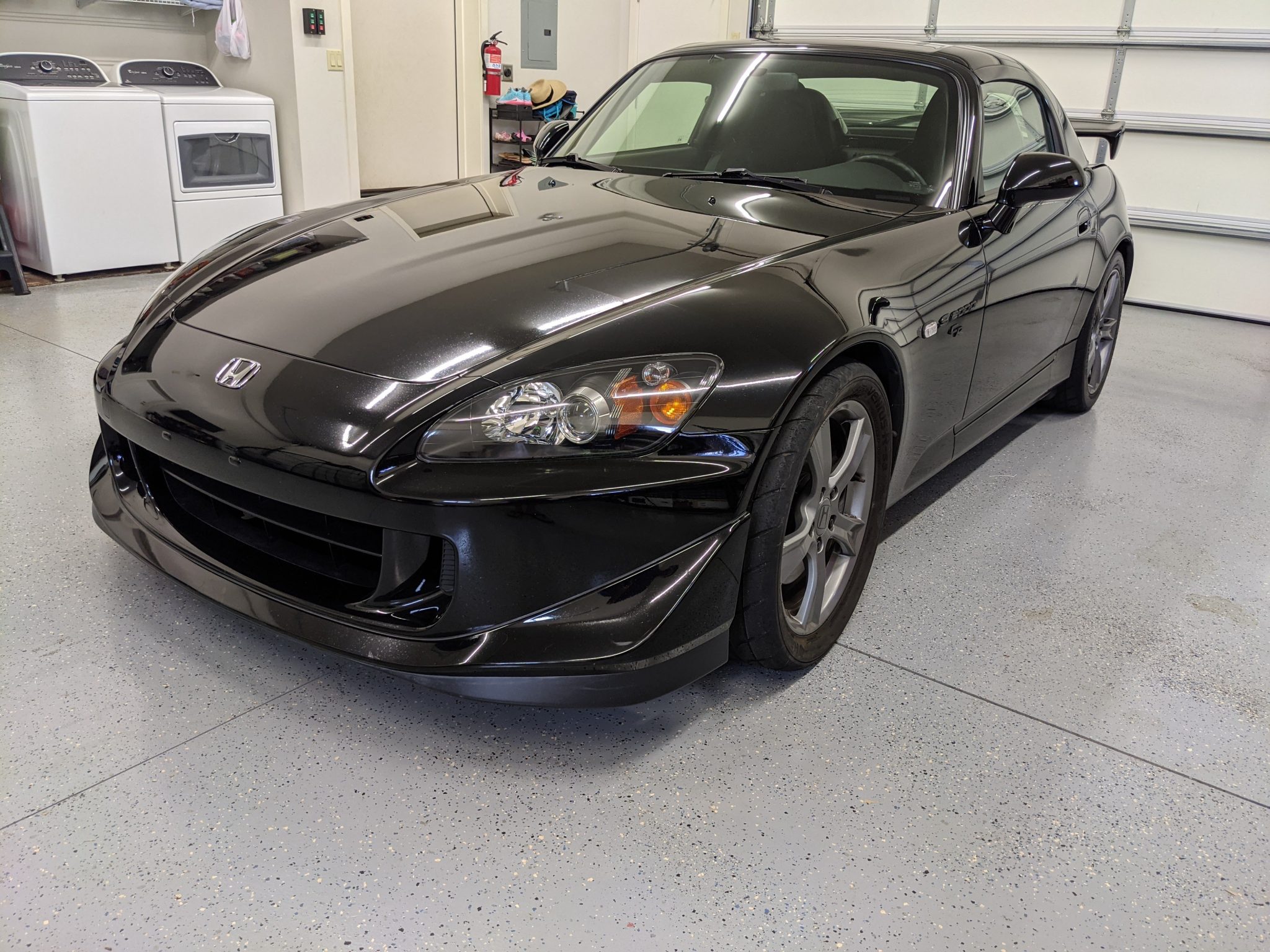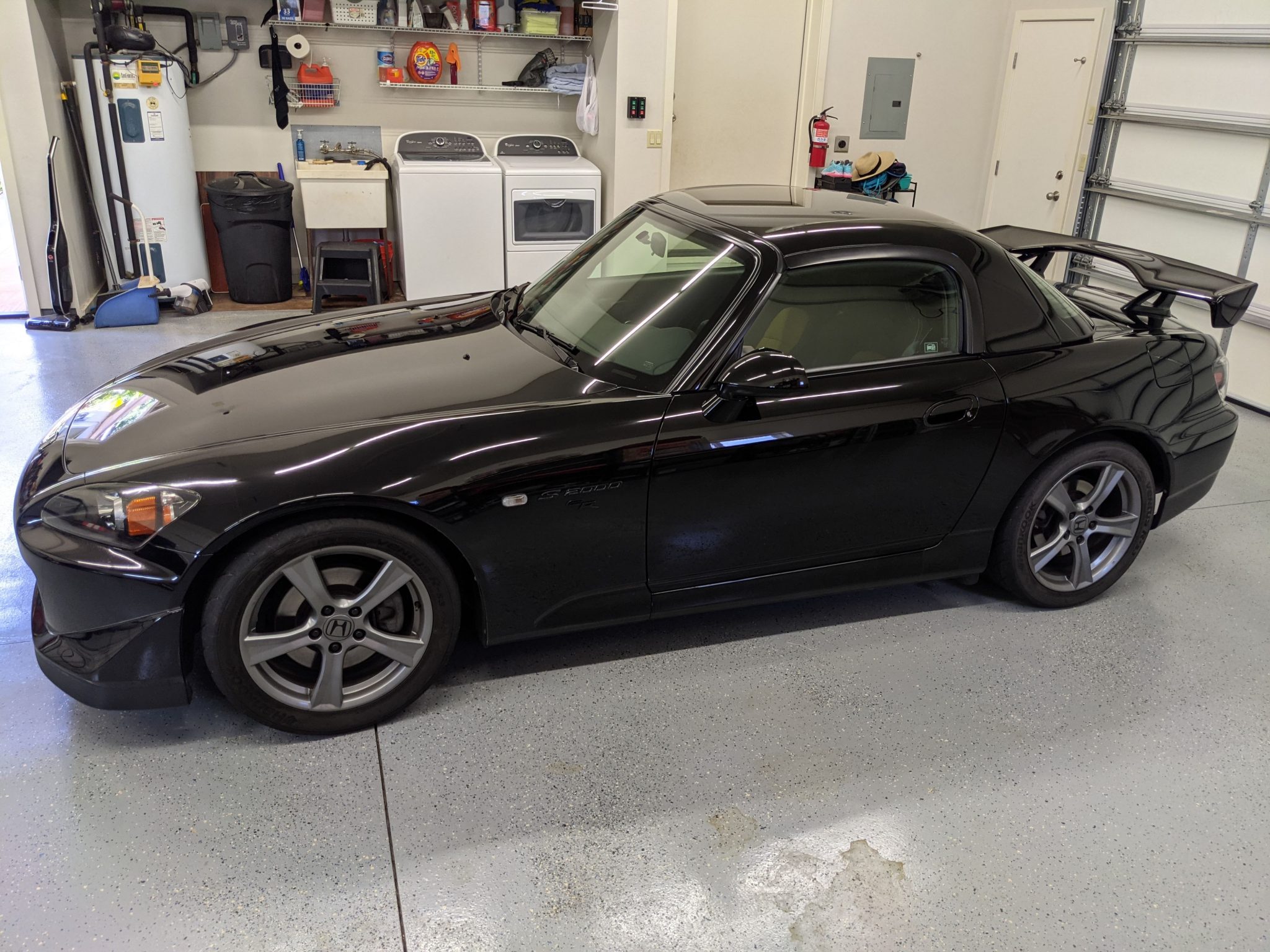 Factory 17″ five-spoke wheels wear 255/40 Hankook Ventus R-S3 tires that show 2012 date codes. The CR model features higher-rate springs, stiffer anti-roll bars, and a quicker steering ratio compared to the standard AP2 S2000. An Eibach 32mm front sway bar has been installed, and the removed factory sway bar is included in the sale.