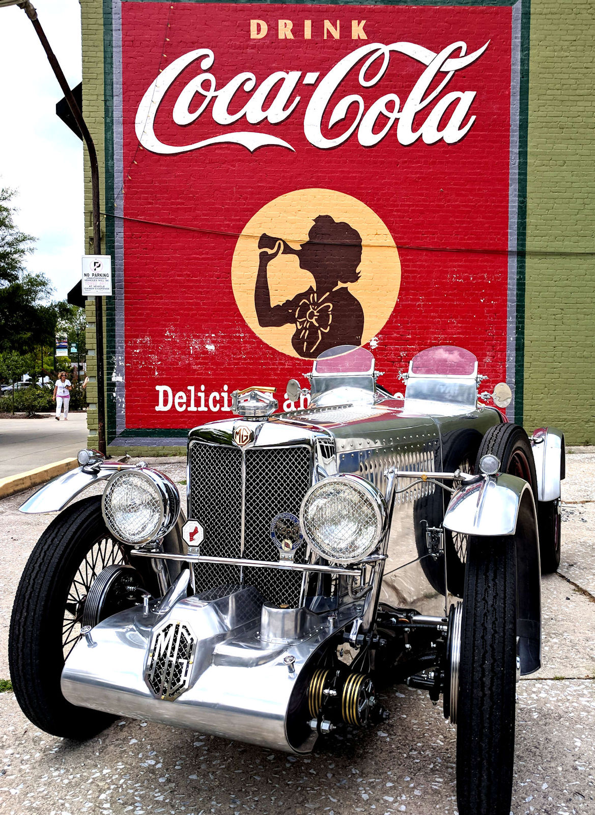 Maroon-painted 19″ wire wheels feature winged knock-offs and wear Ensign tires showing 2017 date codes. A matching spare is strapped to the left side of the body with a custom leather harness. The axles have been overhauled, and replacement friction shocks are fitted front and rear. Braking is from four-wheel Alfin drums.