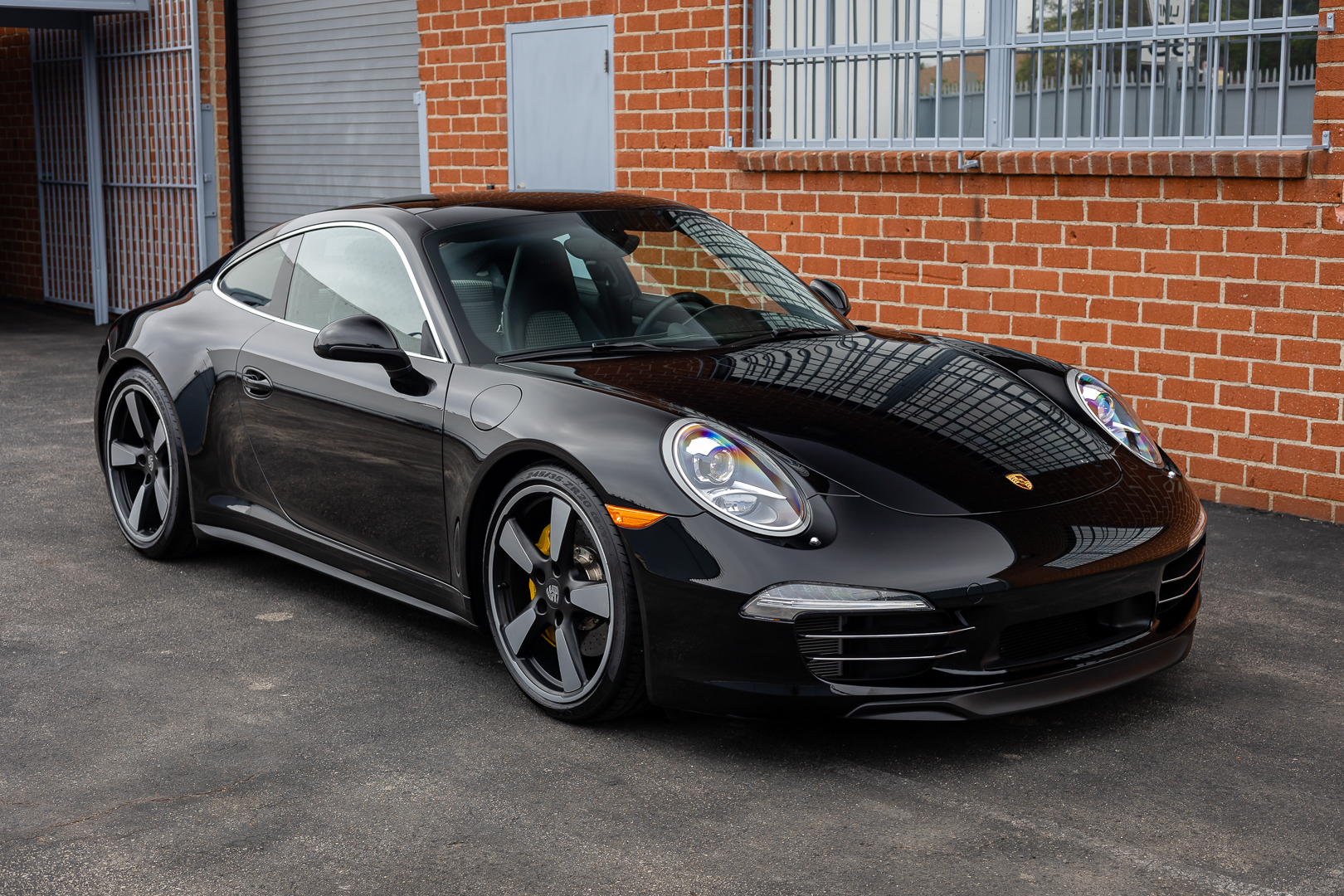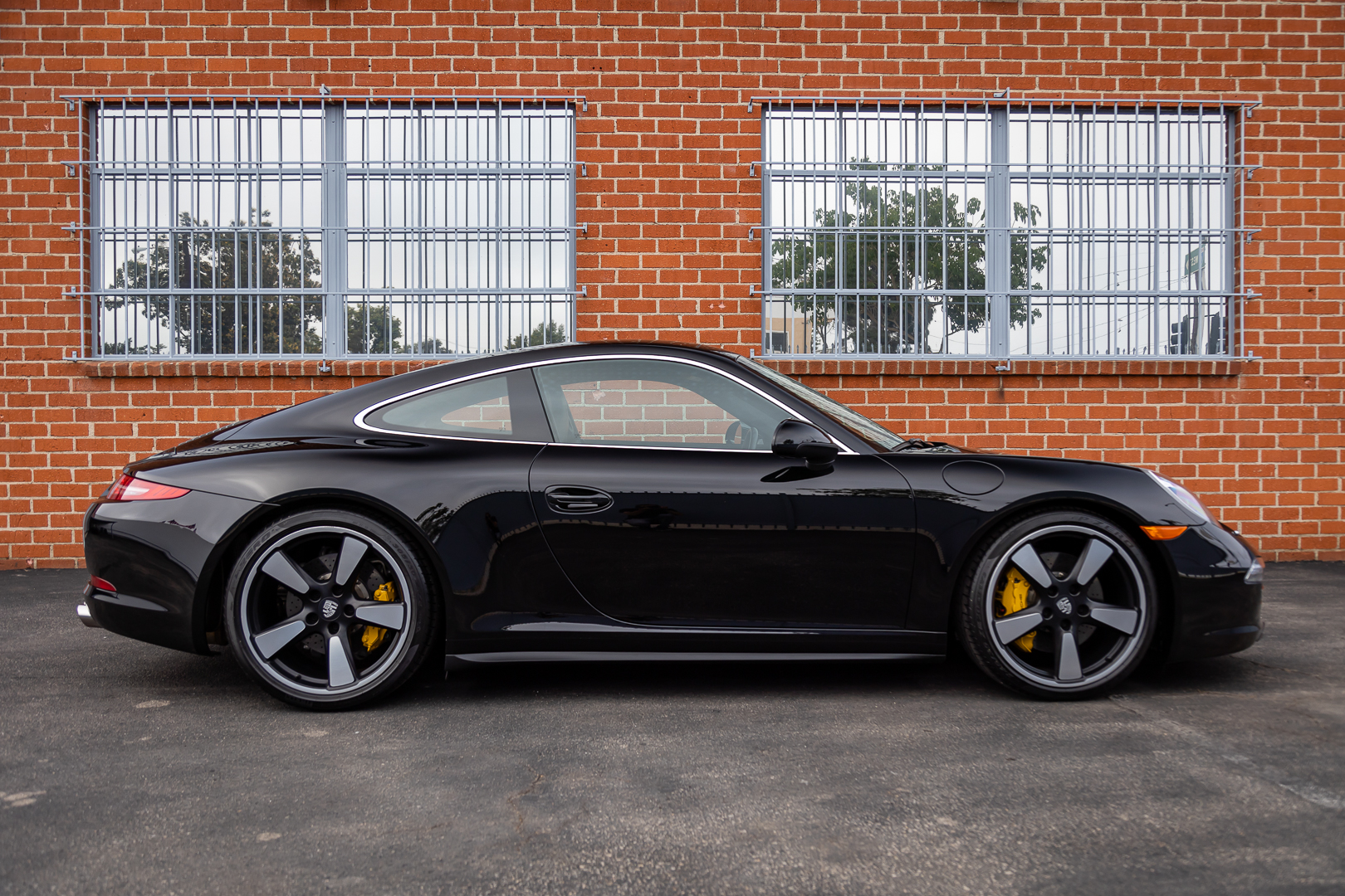 The 50th Anniversary Edition sits 10mm lower than the standard Carrera and is equipped with Fuchs-inspired 20″ Sport Classic wheels, which here are mounted with Pirelli P Zero tires fitted in preparation for the sale. The Porsche Ceramic Composite Brakes (PCCB) feature yellow-finished six-piston calipers in the front and four-piston units in the rear. The car is also equipped with Porsche Dynamic Chassis Control (PDCC) and Porsche Active Suspension Management (PASM).