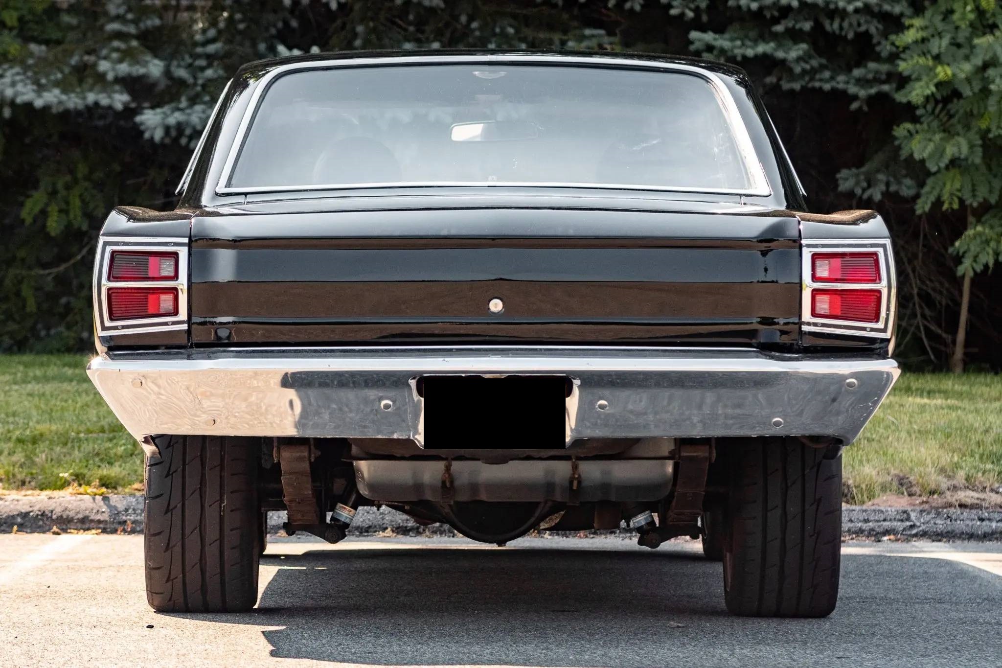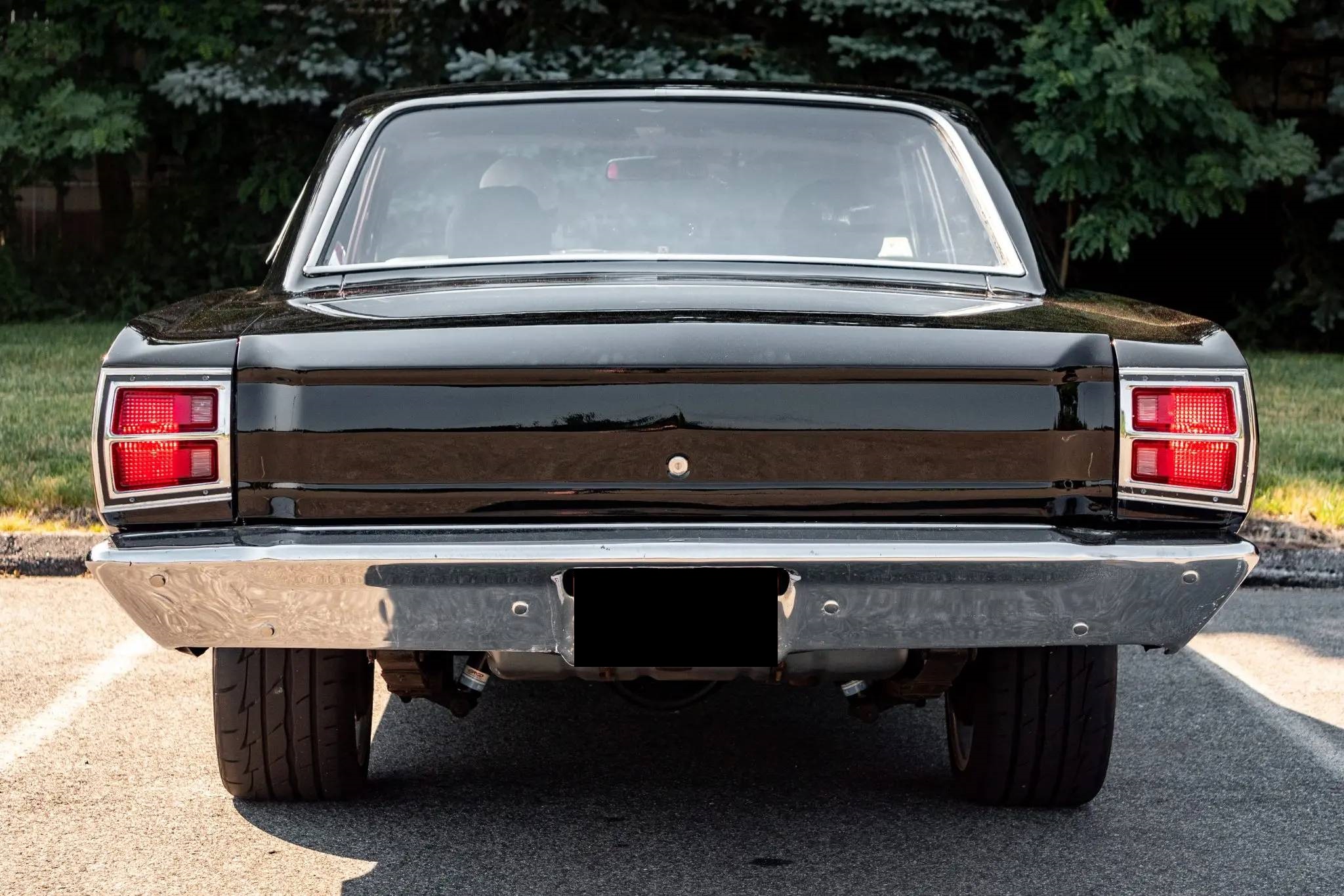 Polished 18″ American Racing Torq Thrust wheels are mounted with 225/45 front and 265/35 rear Firestone Firehawk Indy 500 tires. The car is equipped with a Borgeson power steering system, an aftermarket torsion bar, A-Body-spec front disc brakes, tubular front upper control arms, Bilstein shocks, custom-fabricated shock towers and bracing, and aftermarket frame connectors, and mini-tubbed rear leaf springs.