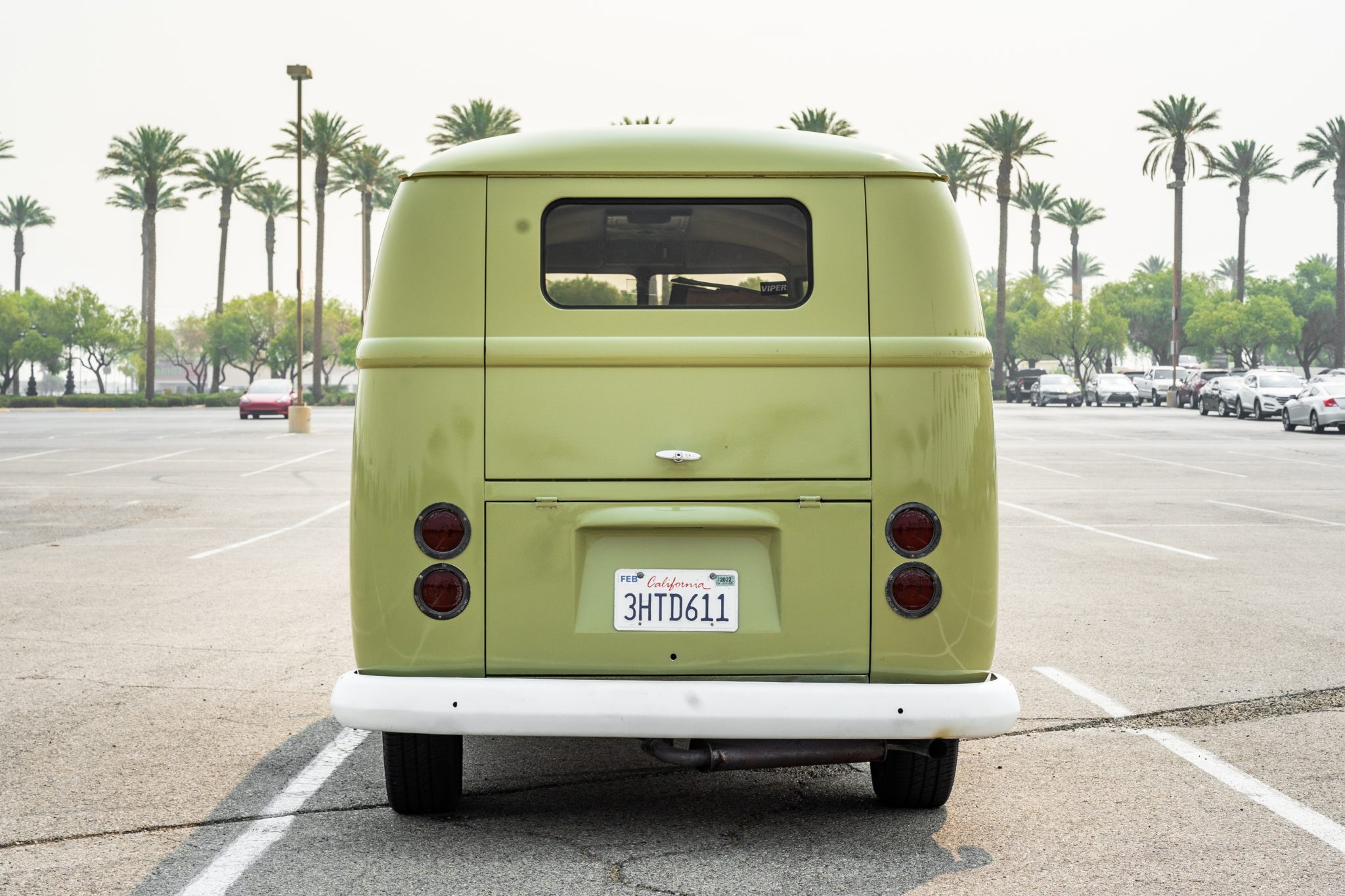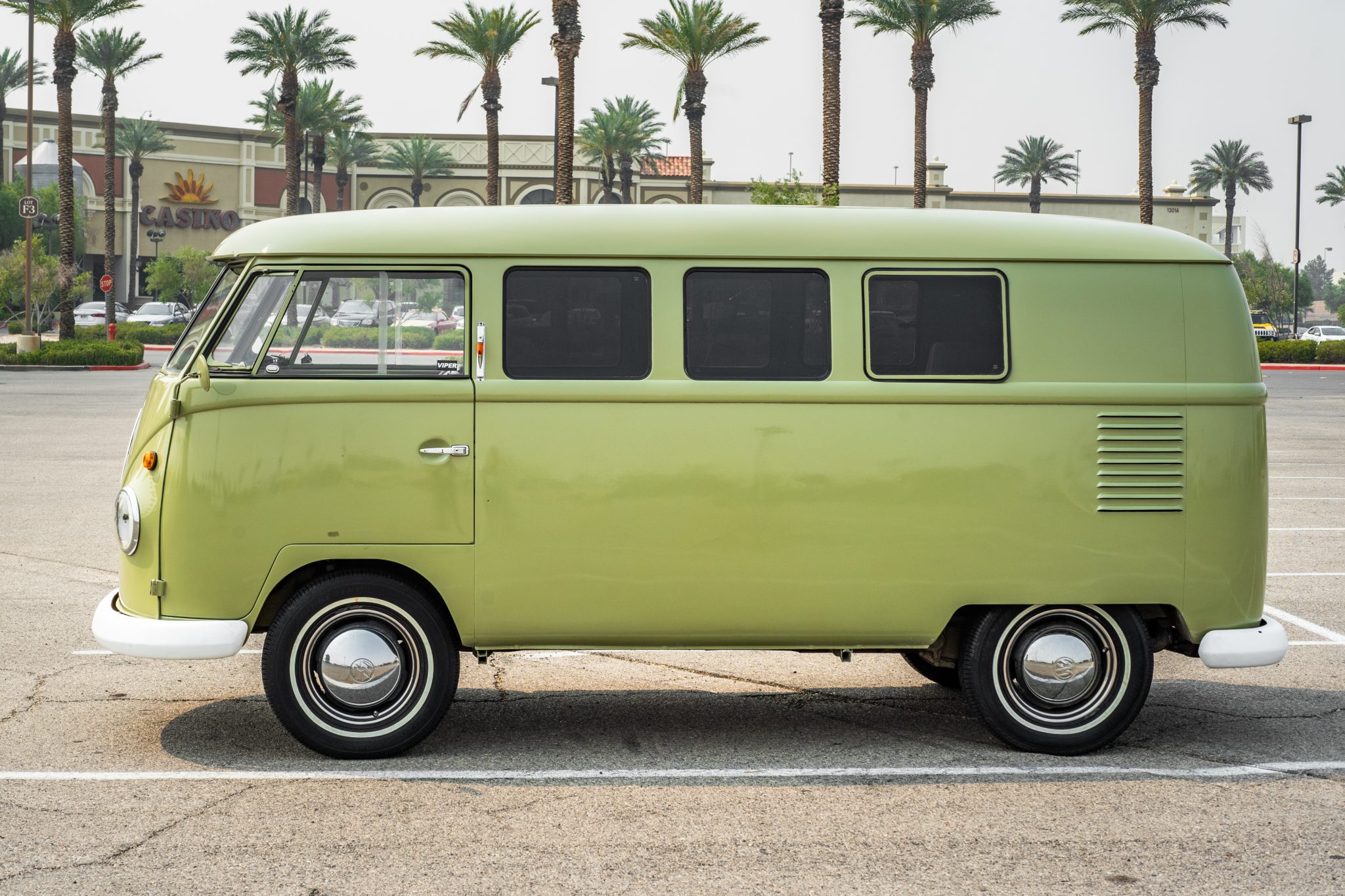 Black 15″ steel wheels with chrome VW-branded hubcaps are mounted with 205/70 Bridgestone Weatherforce Plus white-stripe tires, and a spare is stowed in a storage compartment beneath the front bench seat. The seller notes that the parking brake is not connected. Photos showing corrosion on the wheels are included in the gallery.