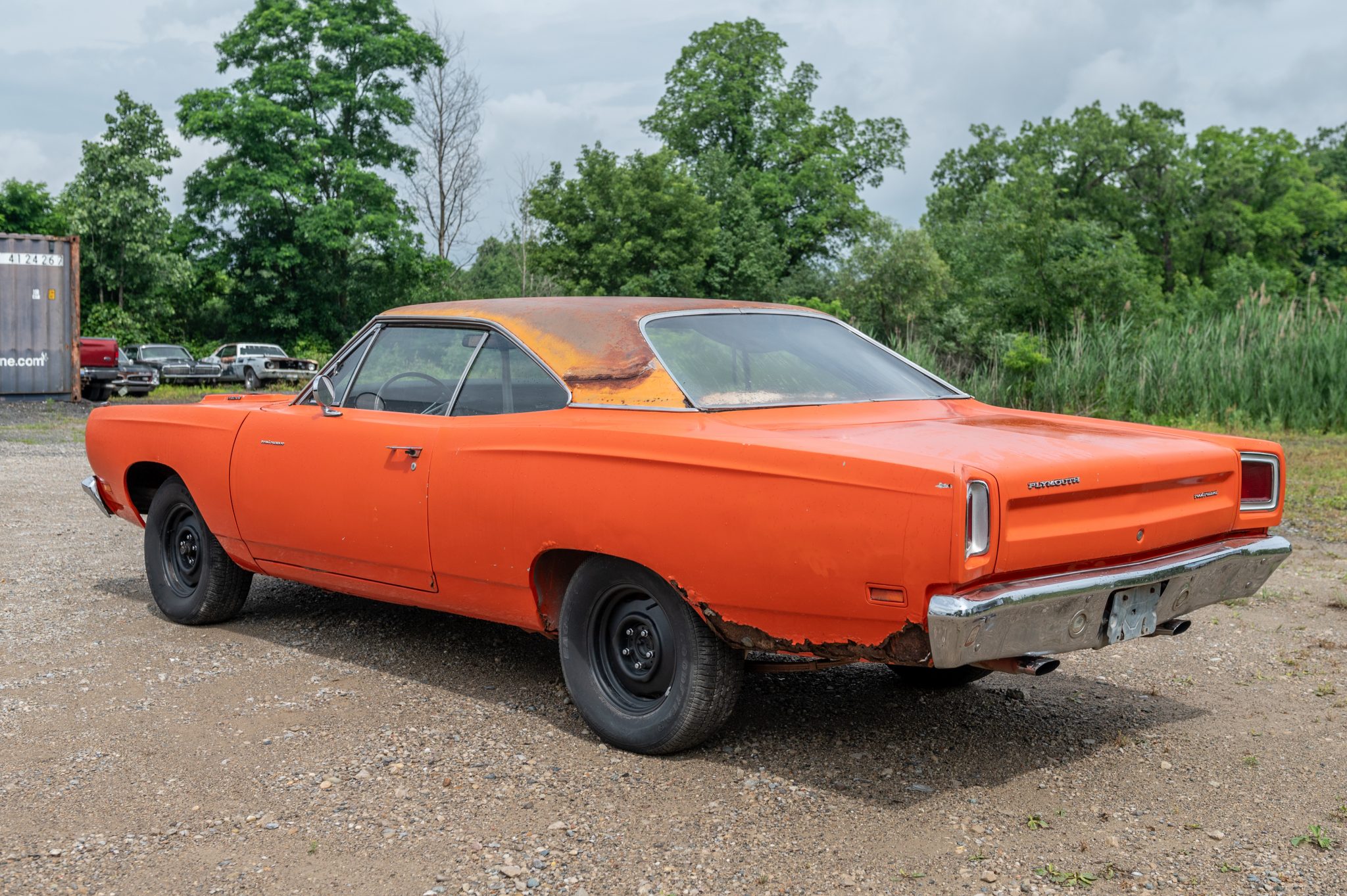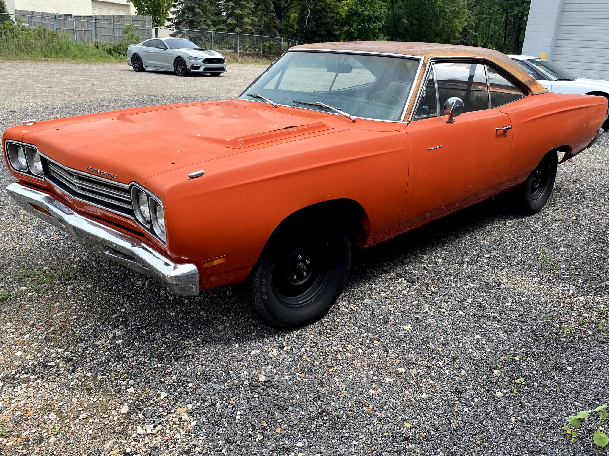 The black 15″ steel wheels are mounted with 225/70 Goodyear Eagle GT tires that show cracking on the sidewalls. A white-painted steel wheel with an older whitewall tire is mounted in the trunk. Braking is handled by power-assisted front discs and rear drums, and the system was bled in February 2021. The left-front wheel is missing a bolt.