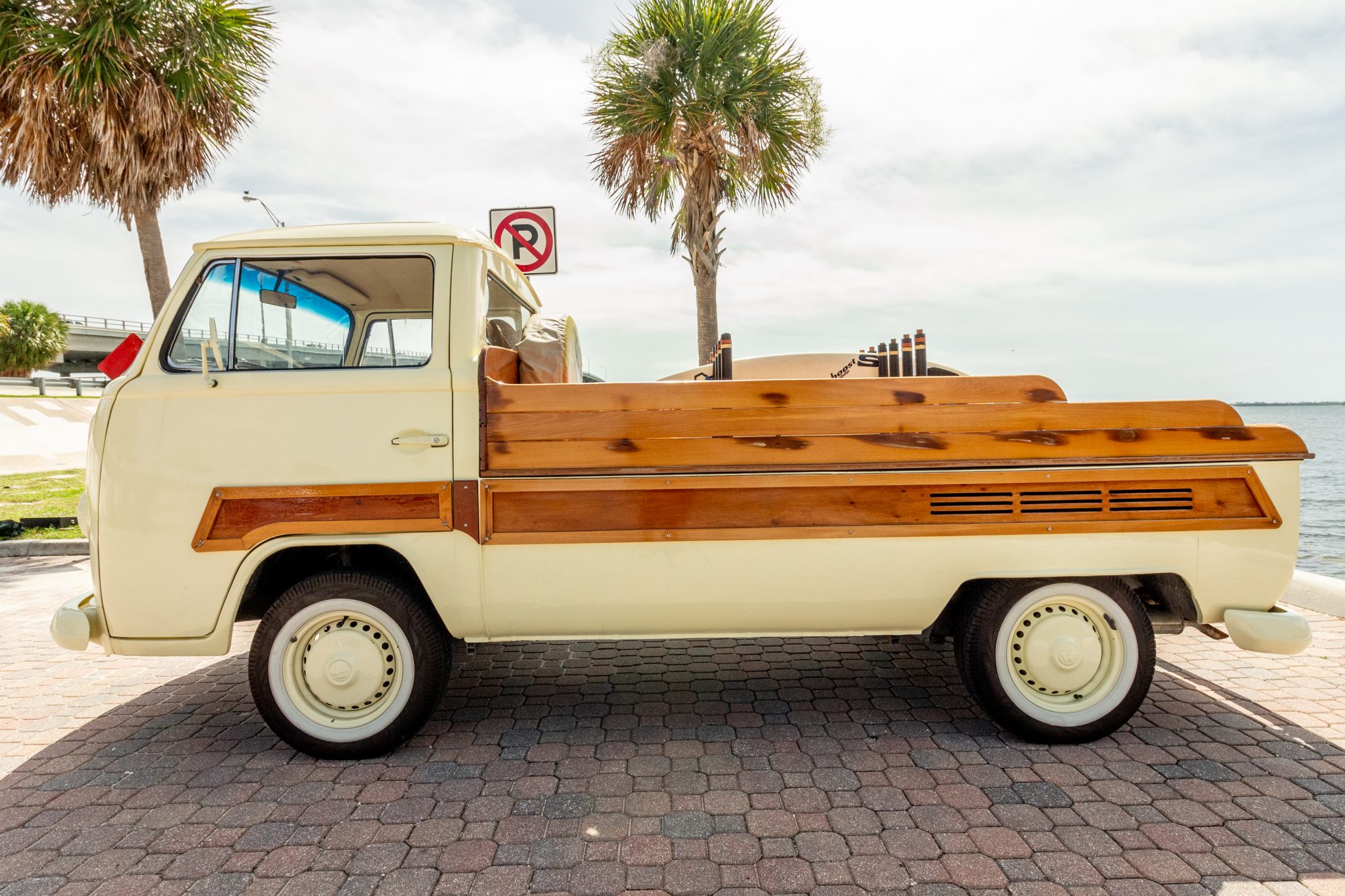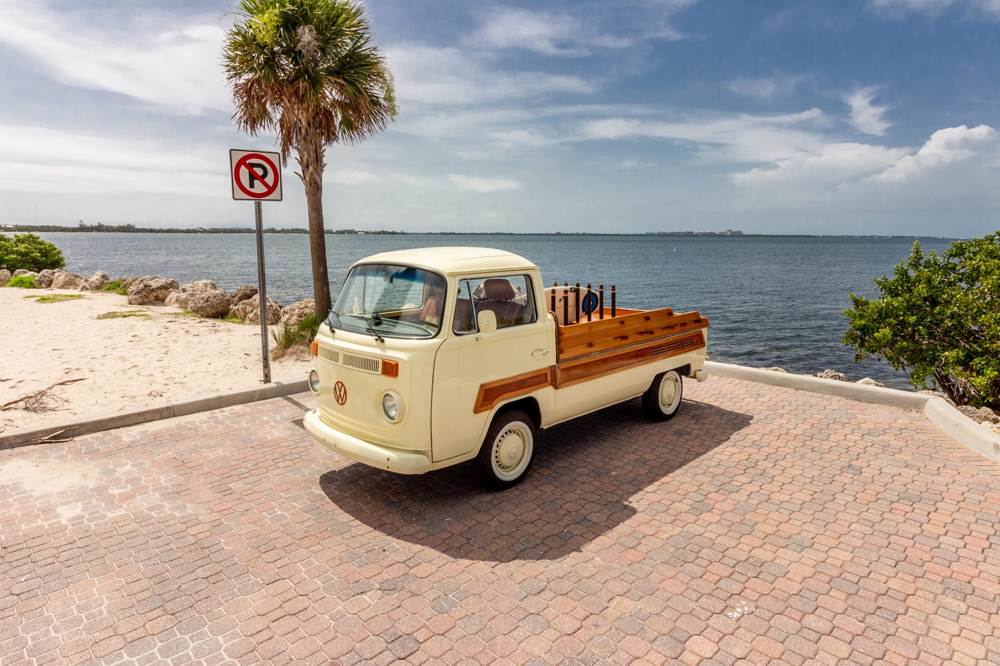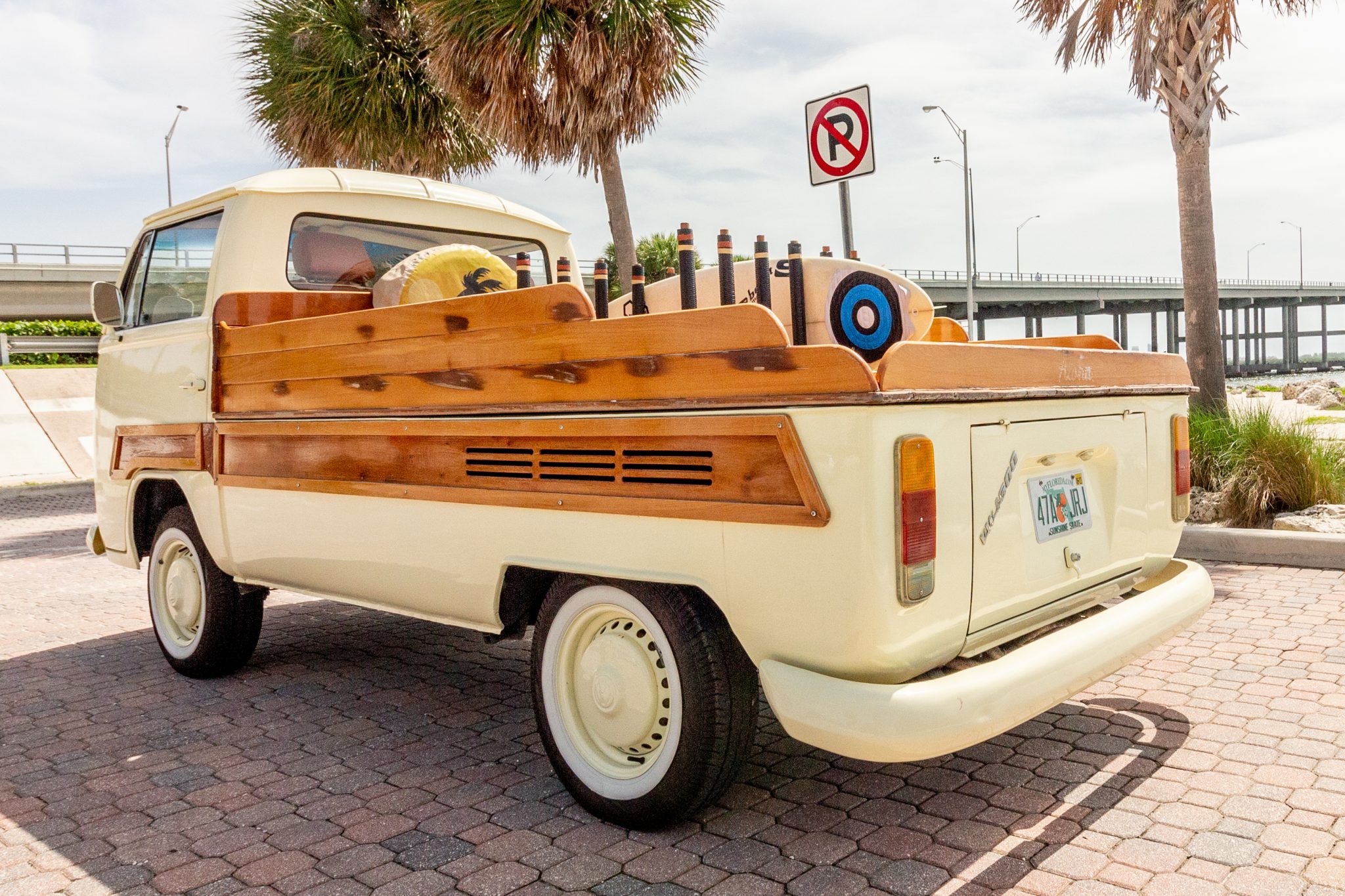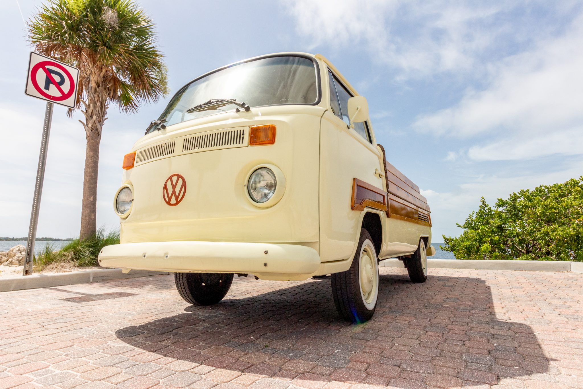 Body-colored steel wheels wear VW-branded hubcaps and Ovation V-02 tires with faux whitewall trim rings. A spare is secured in the bed.