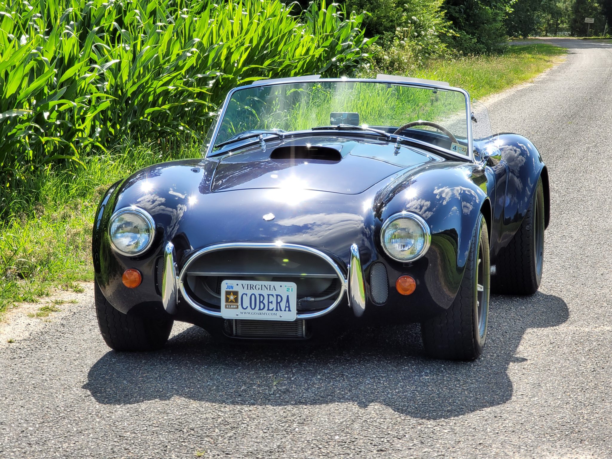 Black-painted 15″ Trigo wheels feature three-eared knockoffs and are mounted with 225/60 front and 295/50 rear Avon CR6-ZZ tires. The car features Jaguar independent rear suspension, a dual-basin master cylinder, 11″ front rotors, inboard rear disc brakes, Spax adjustable coilovers, and sway bars.