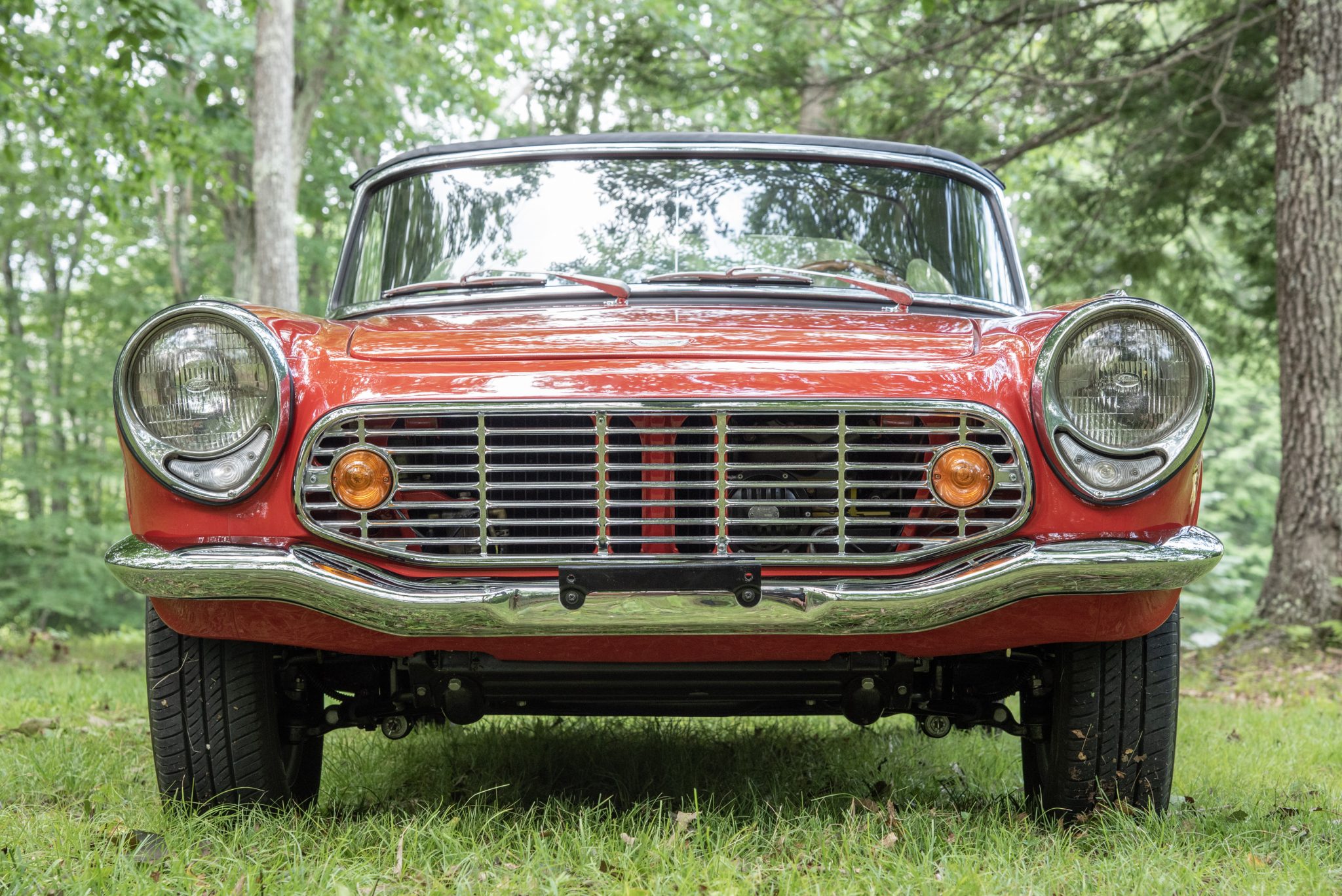 Five-spoke 13″ wheels wear chrome hubcaps and 155/80 Thunderer City tires. The suspension and brakes have been refurbished.