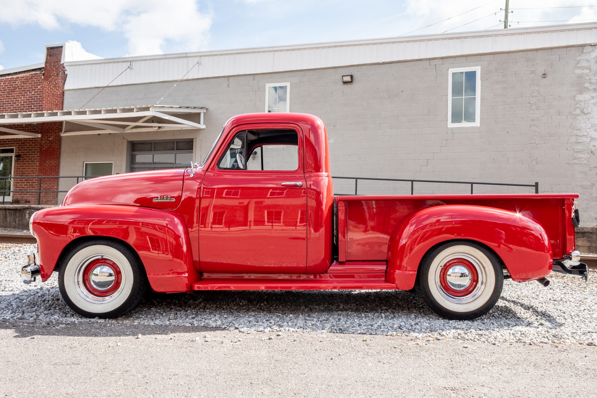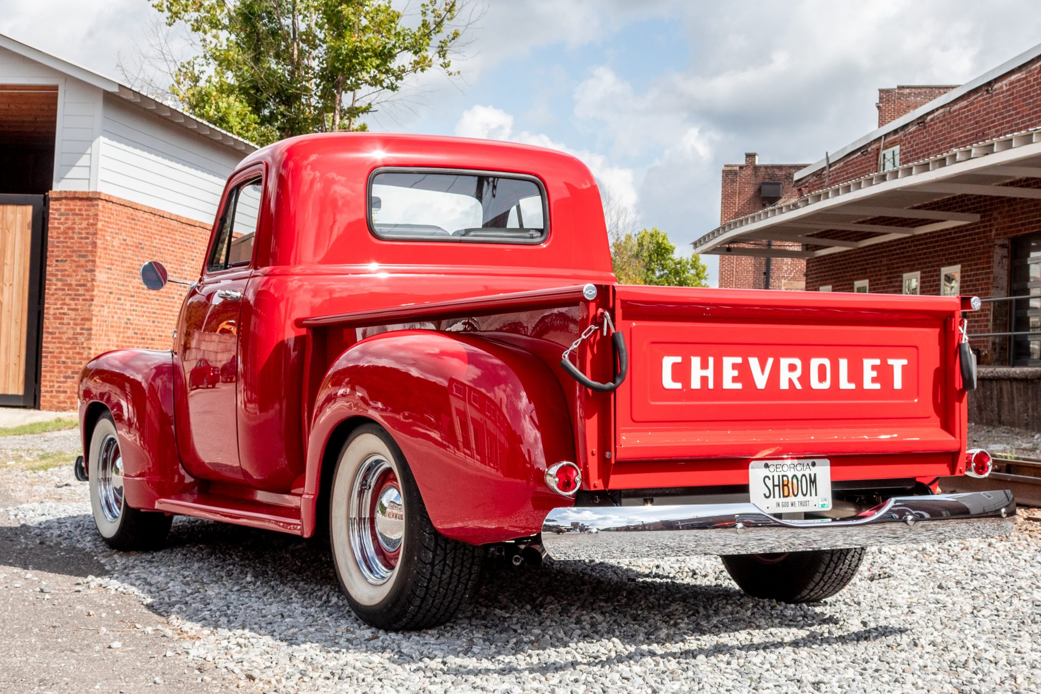 Red-painted 15″ steel wheels wear chrome hubcaps and trim rings along with 255/70 BFGoodrich Silvertown whitewall tires. A Mustang II-style front end with tubular A-arms has been installed as part of the refurbishment along with front disc brakes and power steering. The truck sits on adjustable Ridetech shocks and has been lowered according to the seller.