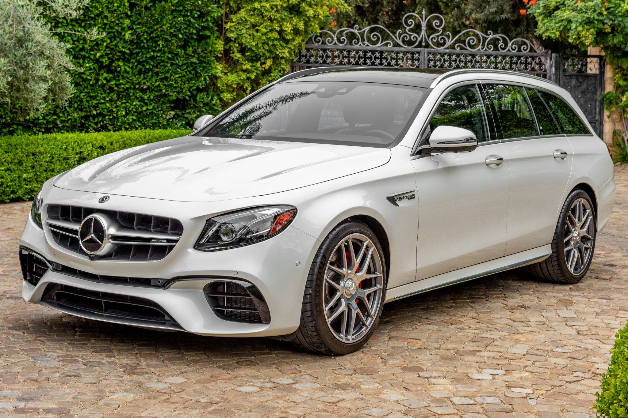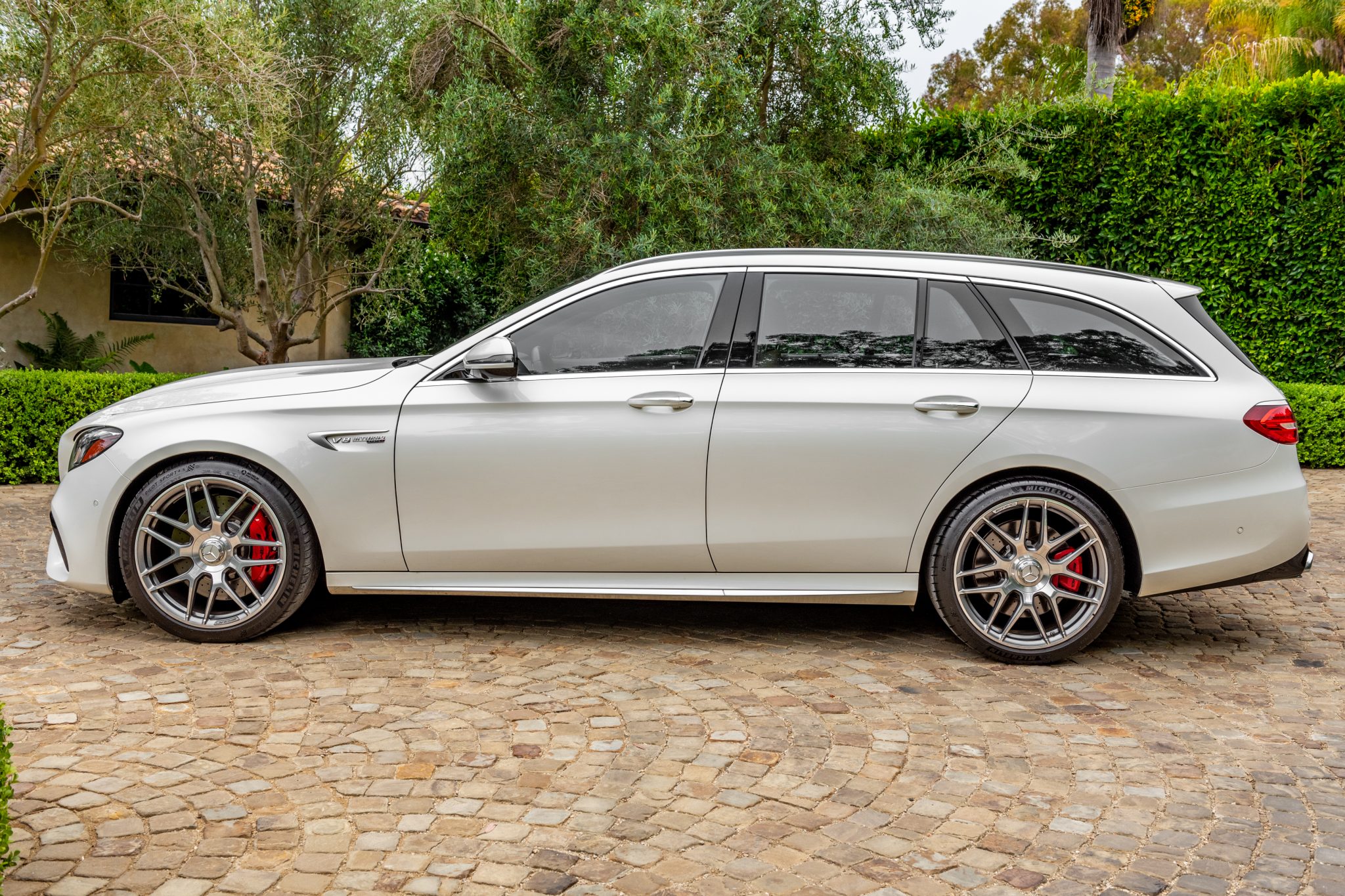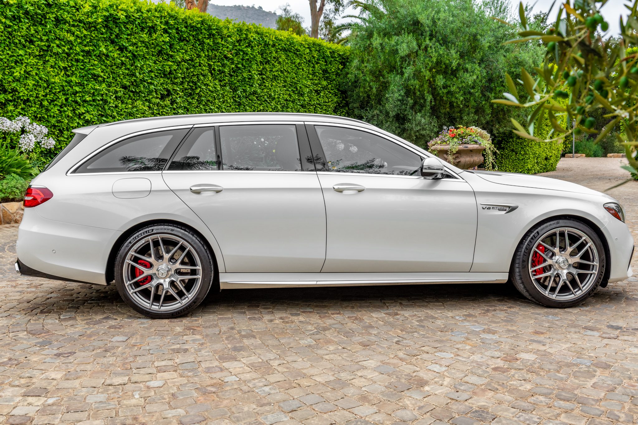 Optional 20″ forged AMG wheels with gray accents are mounted with 265/35 front and 295/30 rear Michelin Pilot Sport 4S tires. Red-finished brake calipers with AMG branding are paired with cross-drilled and slotted rotors at all four corners. The car received an AMG Sport Suspension with Air Body Control from the factory.