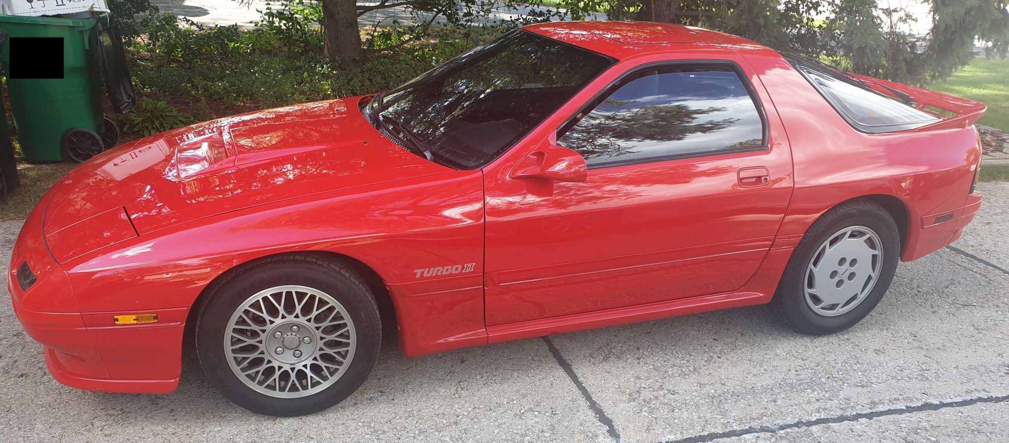 Factory 16″ Mesh alloys are mounted up front, while a pair of earlier-model RX-7 wheels are shown fitted at the rear in the photo above. The seller states that both sets of wheels are included in the sale and the tires should be replaced due to age. Braking is handled by four-wheel ventilated discs, and the car is equipped with speed-sensing power steering.