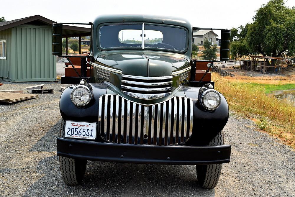 Black 20″ wheels have been media blasted and powdercoated, and they are mounted with Pacifica tires. The truck is equipped with dual rear wheels, and the original GVWR was 15,000 pounds. The seller states that the drum brakes have been turned and the master cylinder, wheel cylinders, and wheel bearings have been replaced.