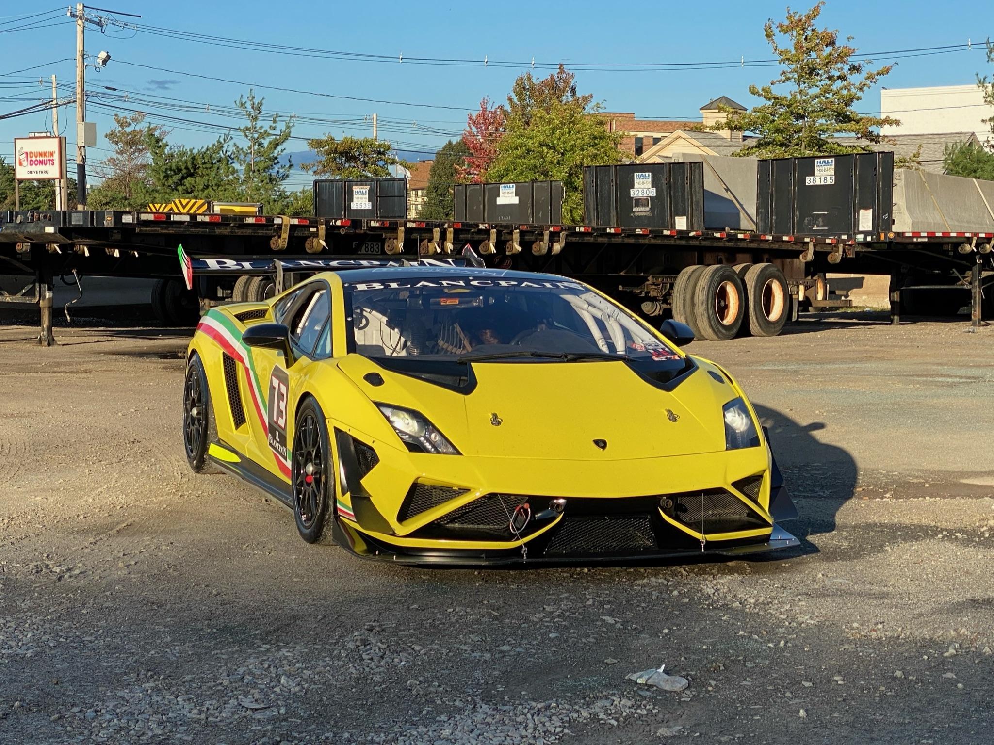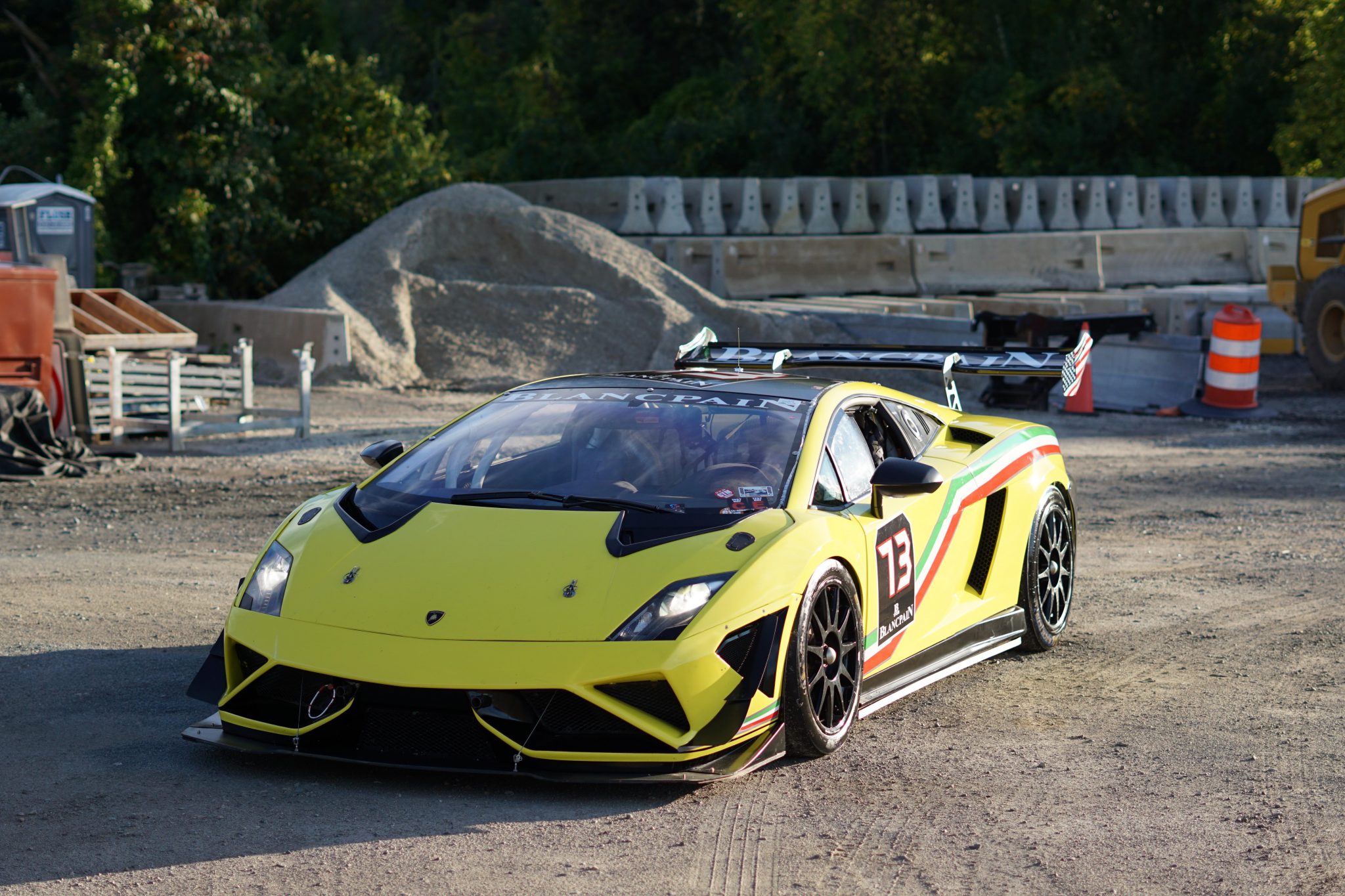 Black-finished 18” Speedline center-lock wheels are wrapped in Michelin race tires. Braking is handled by six-piston front and four-piston rear Brembo calipers over slotted and ventilated rotors, and factory suspension modifications include larger anti-roll bars and Öhlins Racing double-adjustable coilovers.