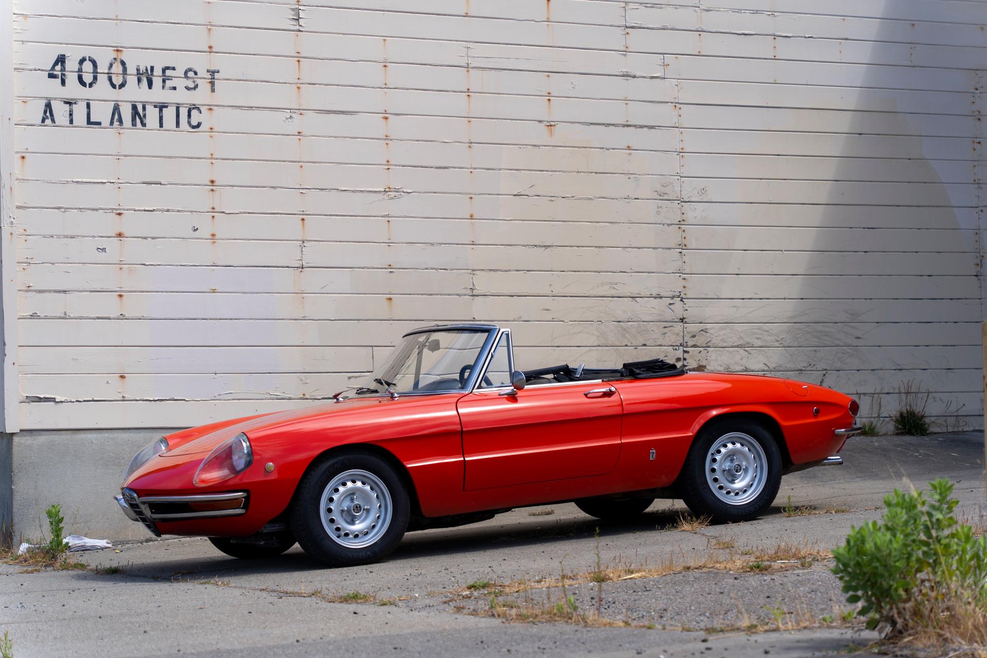 The black soft top features a plastic rear window and was installed in June 2020. The 14″ Alfaholics GTA-style alloy wheels were installed in April 2020, and wear Alfa Romeo center caps and 195/65 Vredestein Sportracs tires. Koni shocks were also installed in 2020, and braking is handled by discs at all four corners.