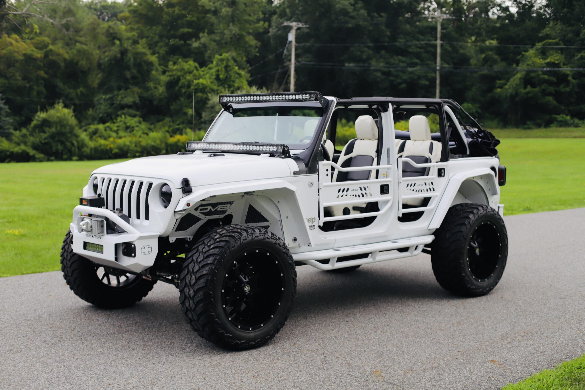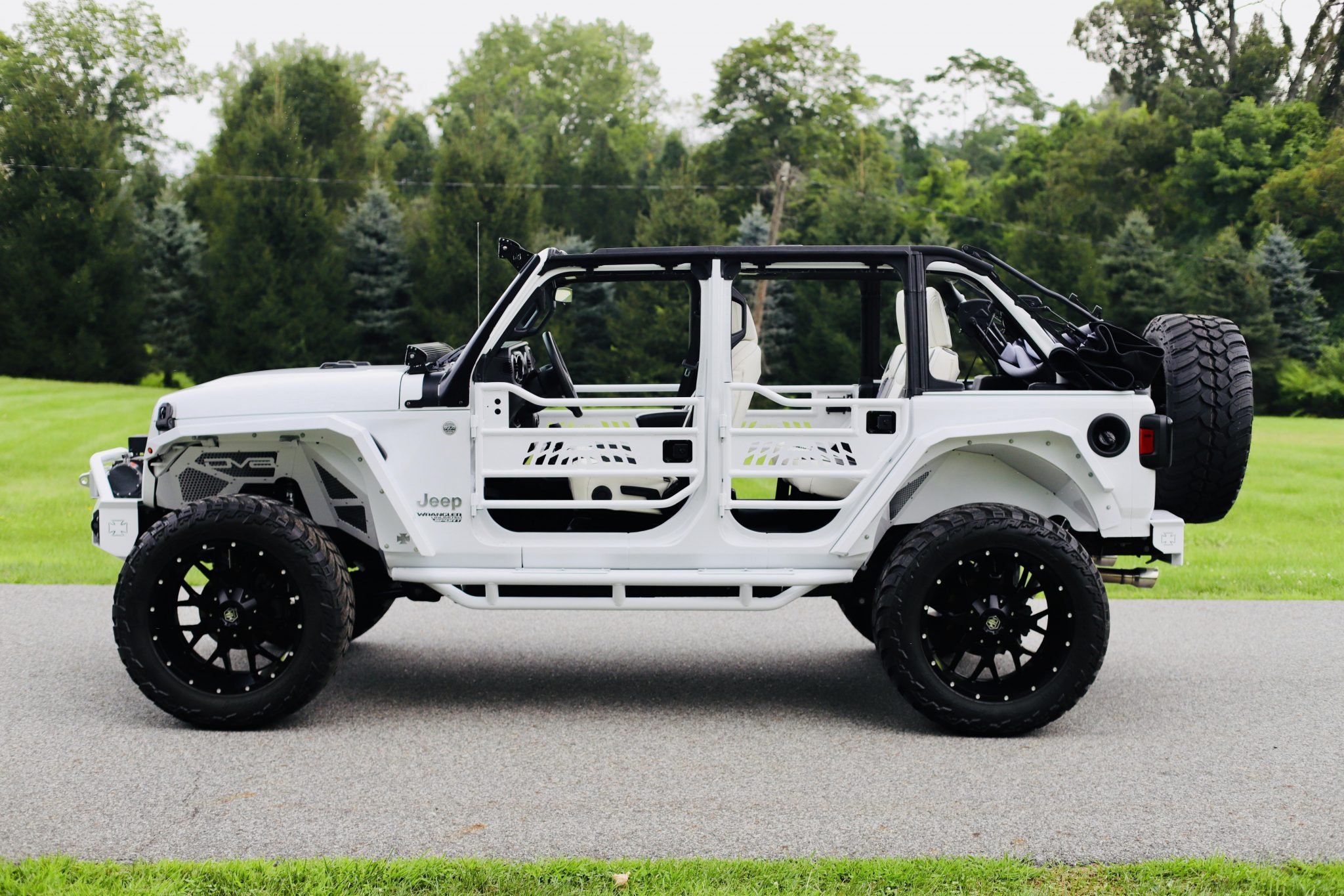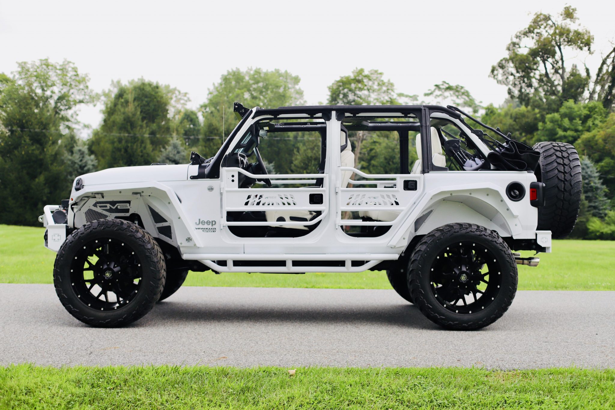 Black-finished 22″ Mayhem wheels wear 37×13.5″ AMP Mud Terrain tires, and a matching spare is mounted at the rear. The truck is said to have been lifted 5″ over Fox and Skyjacker suspension components. A set of Aries tubular doors is included in the sale and shown mounted on the truck in the image above.