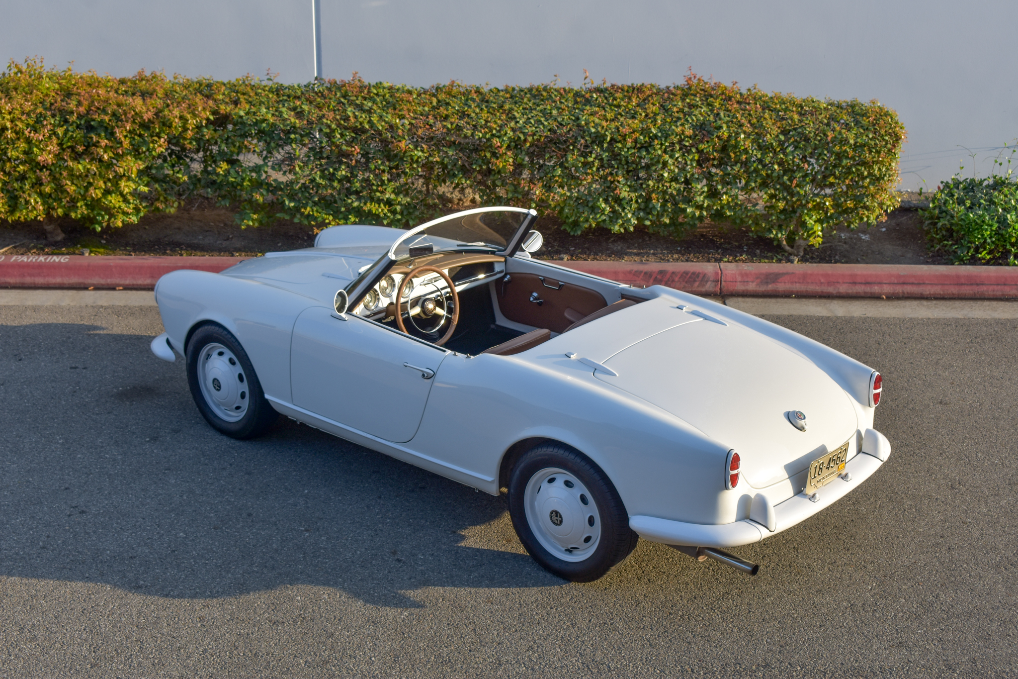 15″ Borrani steel wheels are finished in white with matching hubcaps and are wrapped in 185/65 Pirelli Four Season tires. A front disc brake conversion was carried out.