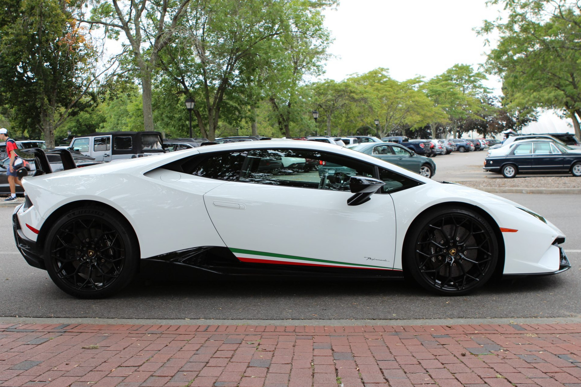 Gloss-black 20″ Narvi forged wheels are wrapped in 245/30 front and 305/30 rear Michelin Pilot Sport 4S tires. Braking is handled by four-wheel carbon-ceramic discs and gloss-black calipers with Lamborghini script. The car is equipped with an active magnetorheological suspension and lifting system.