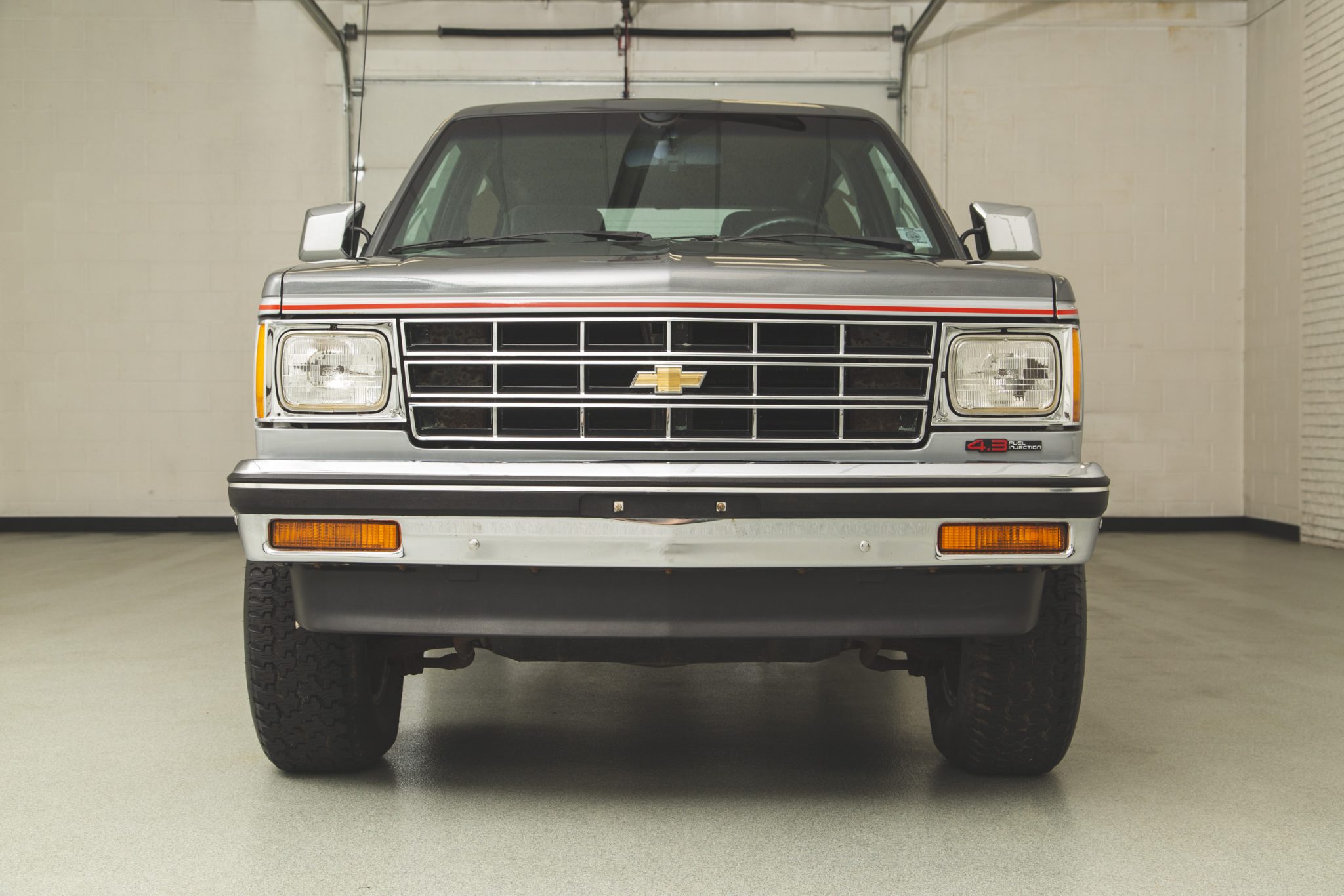 Factory 15″ alloy wheels with 4×4 scripts are mounted with older 235/75 Goodyear Wrangler tires that should be replaced due to age. A spare wearing a Blazer-branded cover is mounted to a swing-out carrier at the rear. The truck was factory-equipped with power steering and front disc brakes.