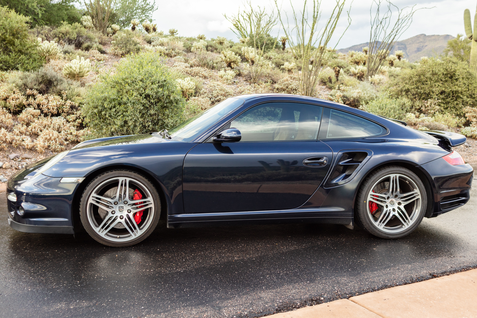 Split-spoke 19” Turbo wheels are mounted with Bridgestone Potenza RE050A tires measuring 235/35 up front and 305/30 in the rear. Stopping power is provided by red-finished calipers over cross-drilled rotors at all four corners.