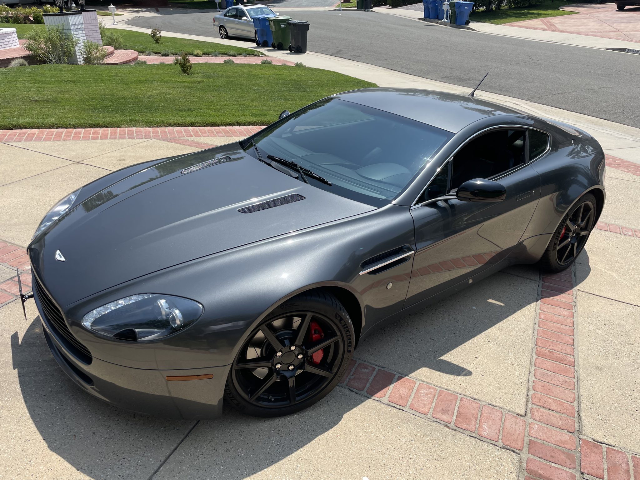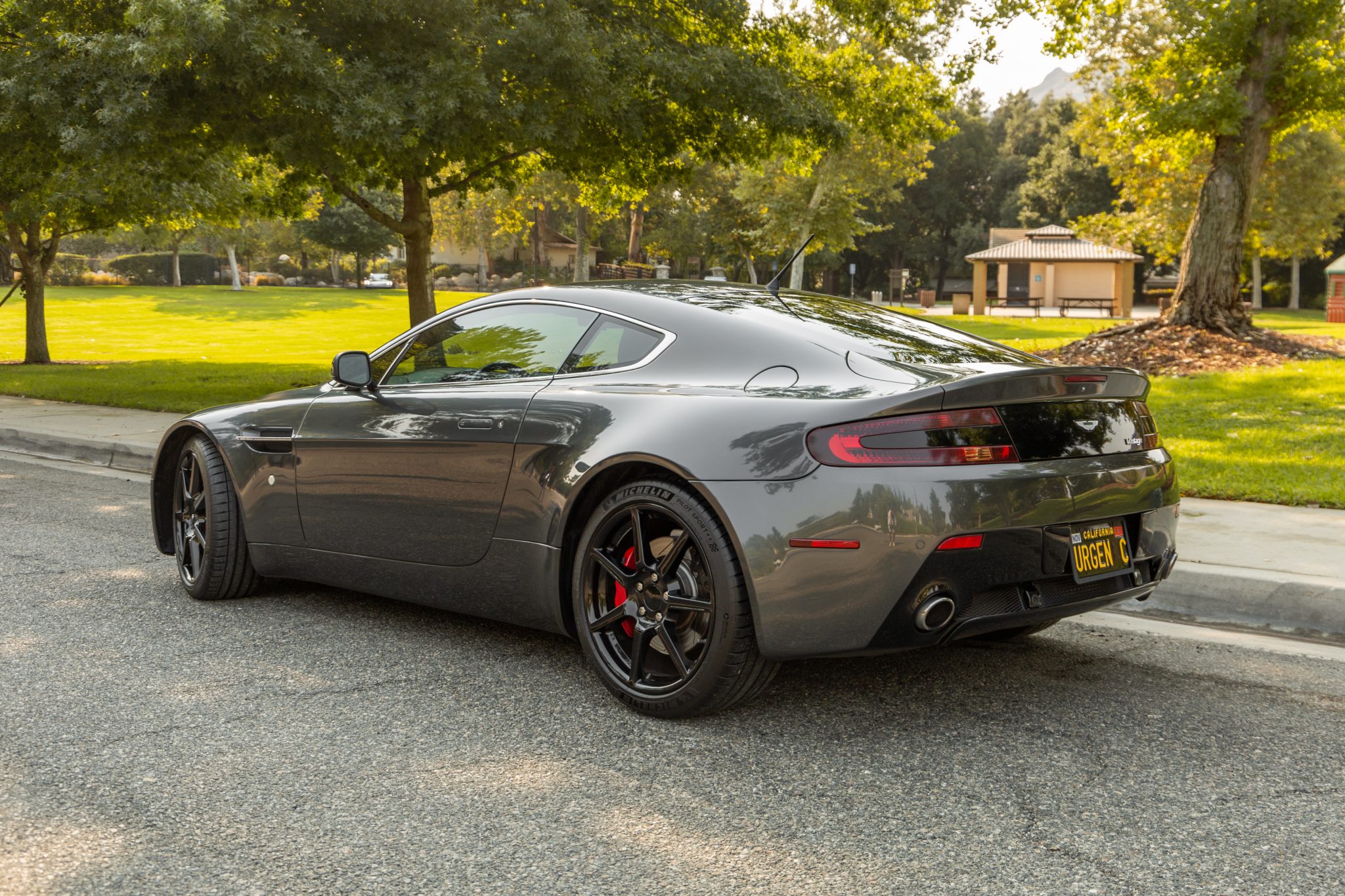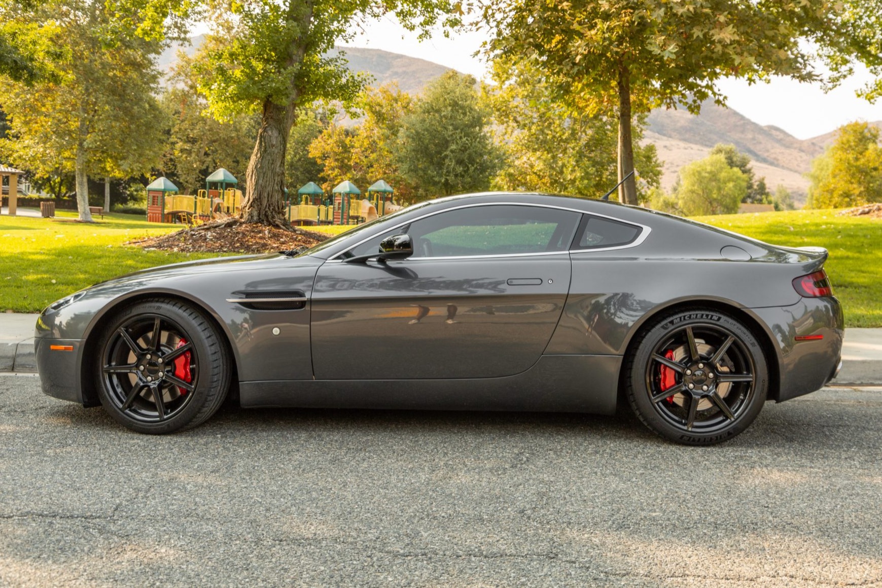 Black 19″ wheels wear 235/40 front and 275/35 rear Michelin Pilot Sport 4S tires that are said to have been replaced in 2021. Red Aston Martin-branded monoblock four-piston brake calipers are paired with slotted discs all around. The seller reports that the rear shocks were replaced in 2021.