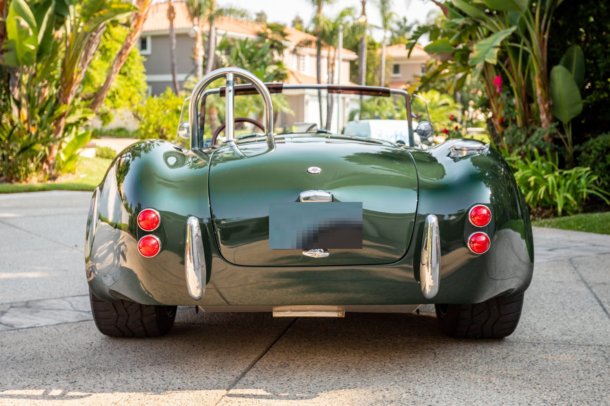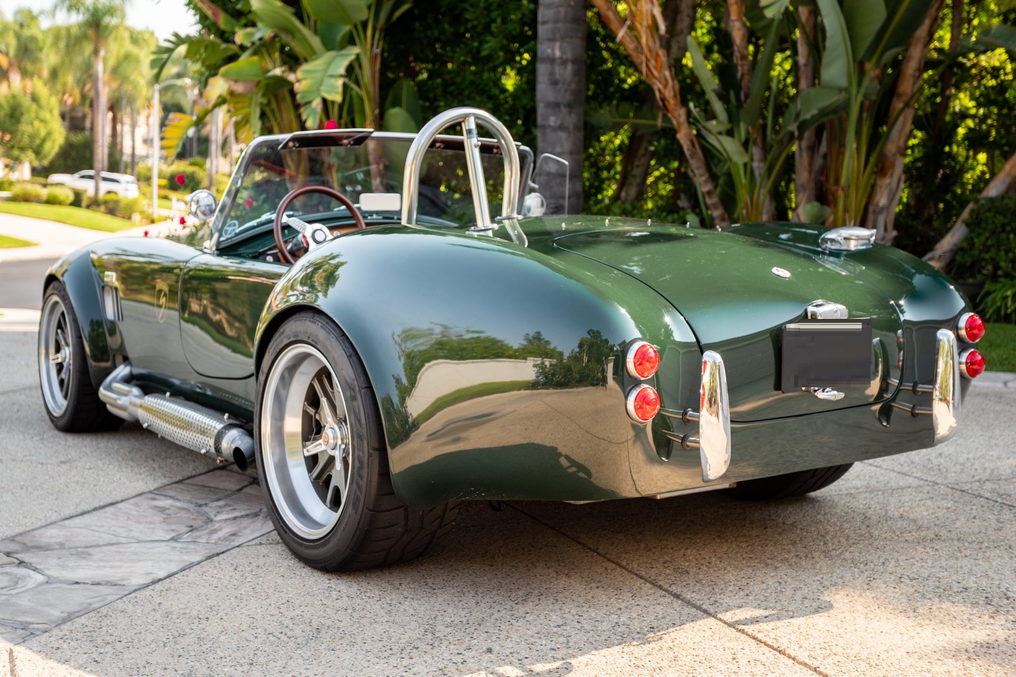 Staggered-width 18″ Halibrand-style wheels with polished lips and three-ear knock-offs wear 245/40 front and 295/40 rear Falken Azenis AT615R tires. Stopping power is from disc brakes at all four corners.