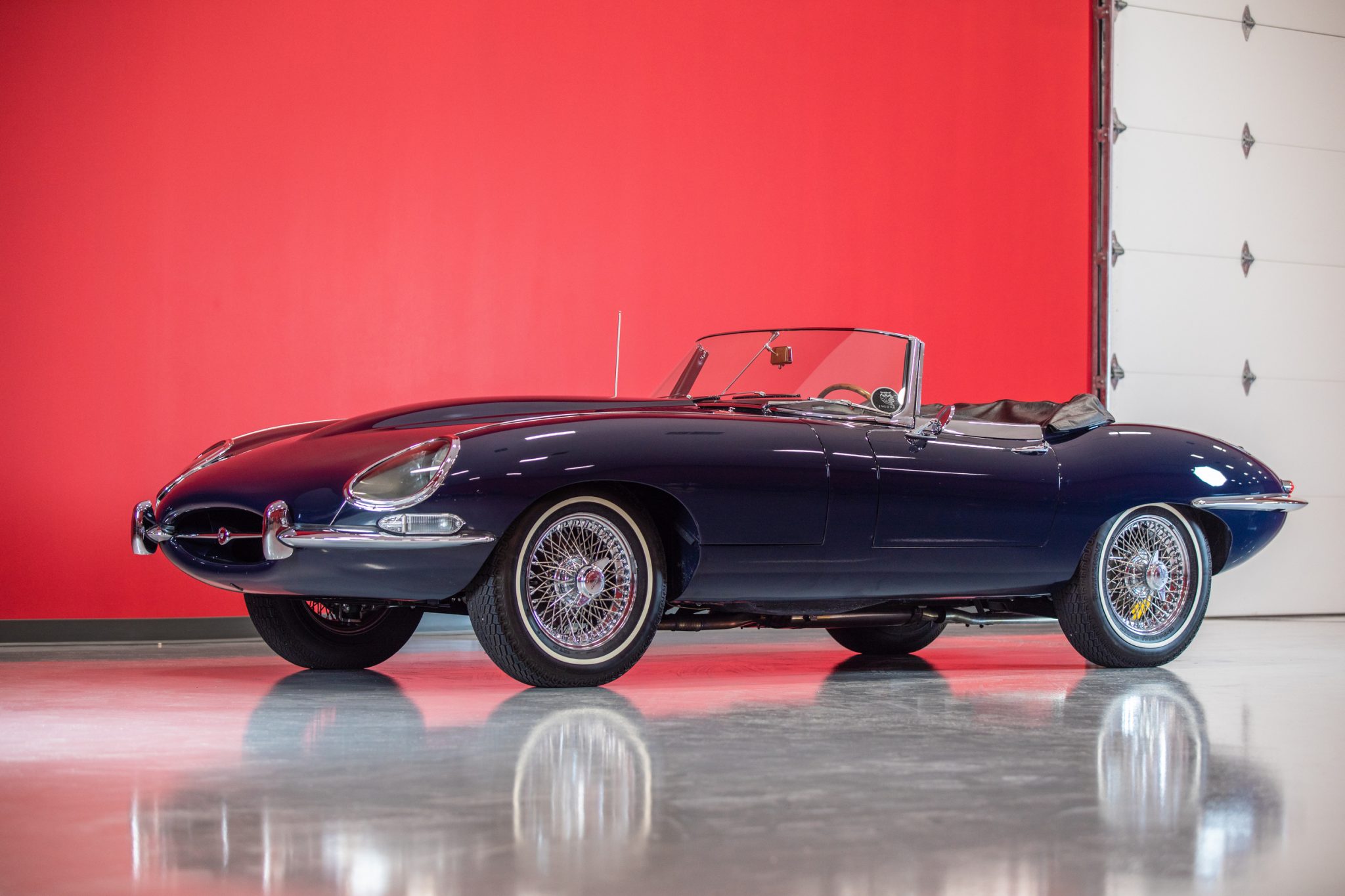 The blue soft top is shown raised above and is stowed under a matching boot. The 15″ wire wheels are mounted with Universal Sport whitewall radial tires. A matching spare wheel with a bias-ply tire is mounted under the trunk floor. The car rides on four-wheel independent suspension with torsion bars up front and coil springs at the rear. Four-wheel disc brakes with inboard-mounted rear rotors were standard equipment.