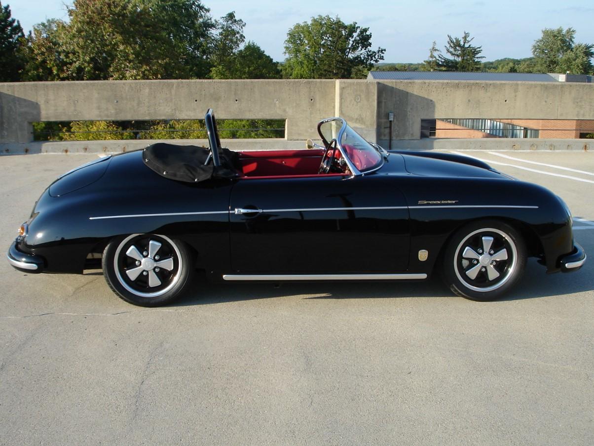 Polished Fuchs wheels with black pockets measure 15×6″ and wear Yokohama tires. A steel wheel with a Goodyear spare tire is stored up front along with tools and a jack. Braking is by 1967 Porsche 911S-sourced vented and cross-drilled rotors up front and 356C-specification discs at the rear, and the system utilizes a 1968 911S dual-circuit master cylinder. The suspension features a 19mm front sway bar, a 356 Enterprises camber regulator, reinforced link pin carriers and front trailing arms, and Koni dampers at all four corners.
