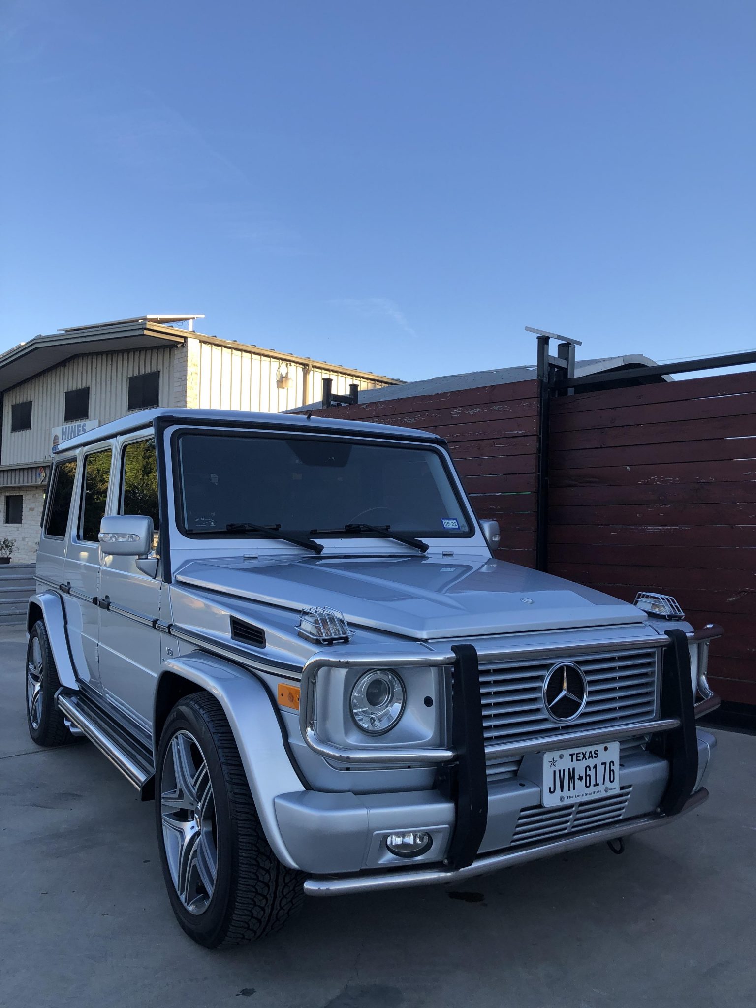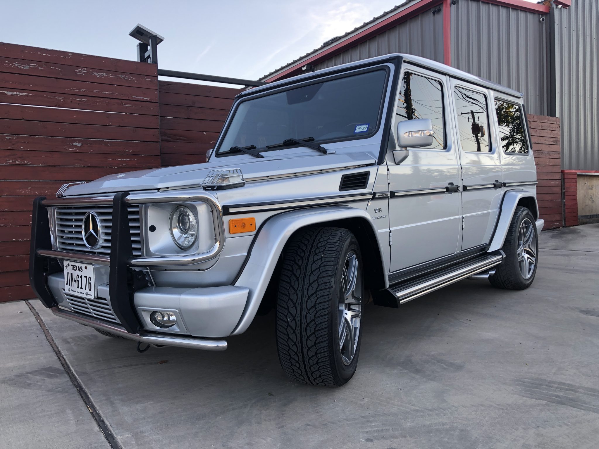 AMG-style 20″ wheels finished in silver and gray are mounted with 265/50 Yokohama Parada Spec-X tires. A spare wheel carrier is mounted to the side-opening tailgate. The seller notes that a KW suspension kit has been added, and the front brakes were serviced with replacement pads and rotors in August 2021.
