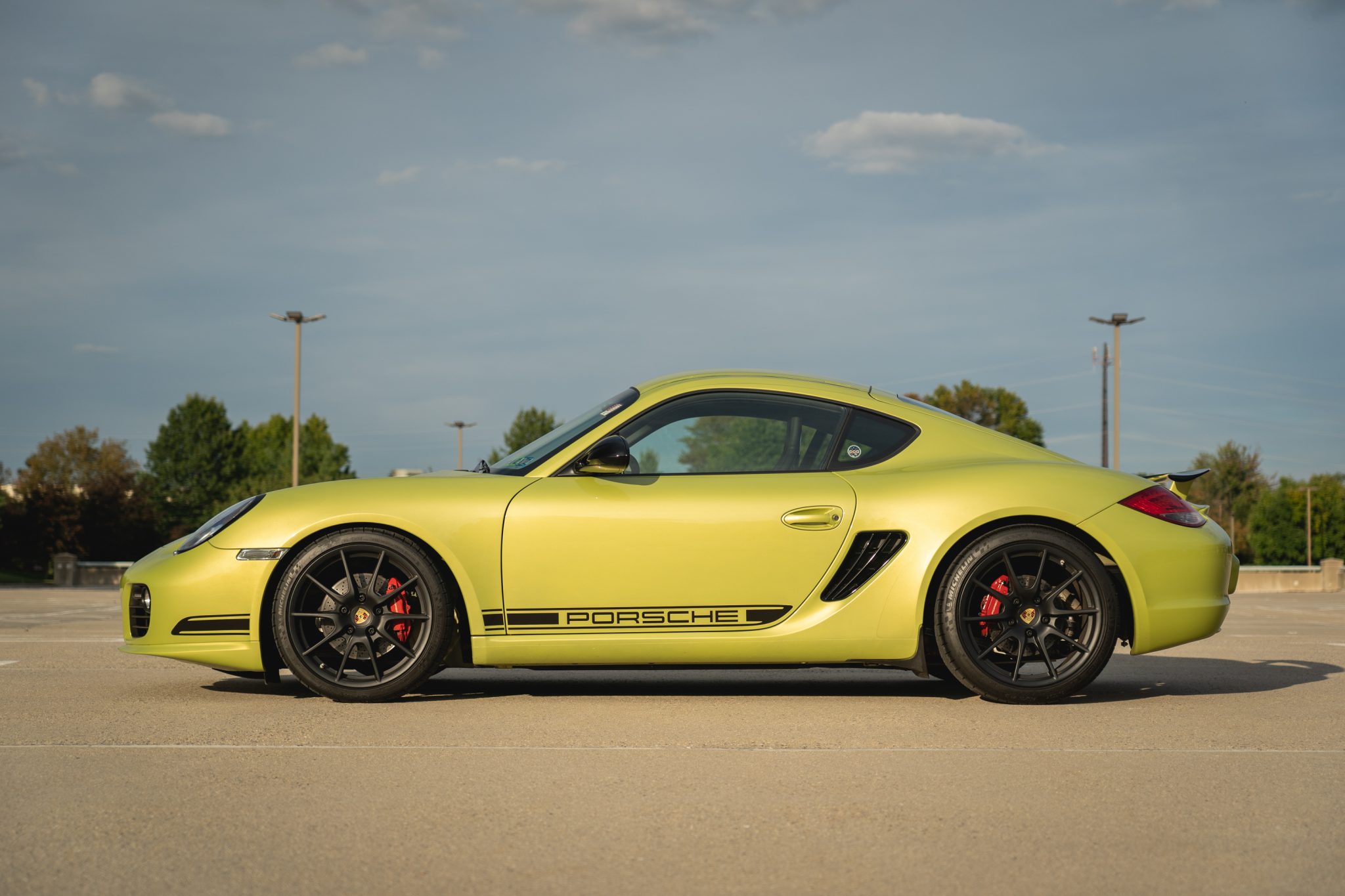 Factory staggered-width 19″ wheels are pictured up close below and are mounted with Michelin Pilot Super Sport tires that were fitted in May 2021. The R model was lowered 0.8″ compared to the standard Cayman S, and a stiffer suspension was also fitted from the factory. Braking is from red multi-piston calipers and cross-drilled rotors all around.