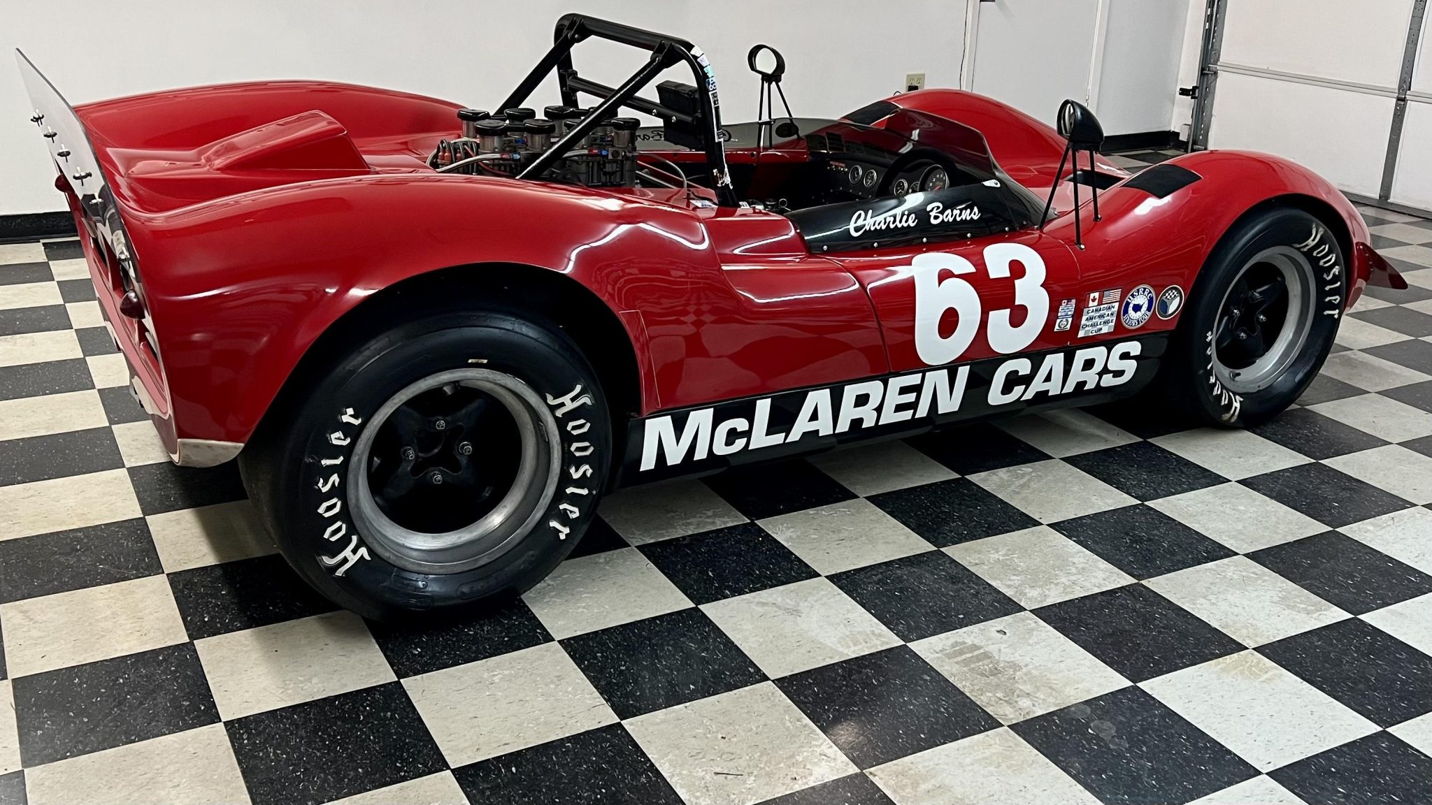 During its 1986 refurbishment, this example was fitted with a new fiberglass body molded in the style of the M1B model, which featured a less-tapered nose than its predecessor as well as a shortened Kamm tail. The body was refinished in its current shade of red at that time, and a refresh carried out within the last year included various repairs and touchups. Features include bottom-hinged doors, a transparent rear spoiler, body-color front flicks, a molded acrylic wraparound windshield, a black roll bar, and dual tripod side mirrors.