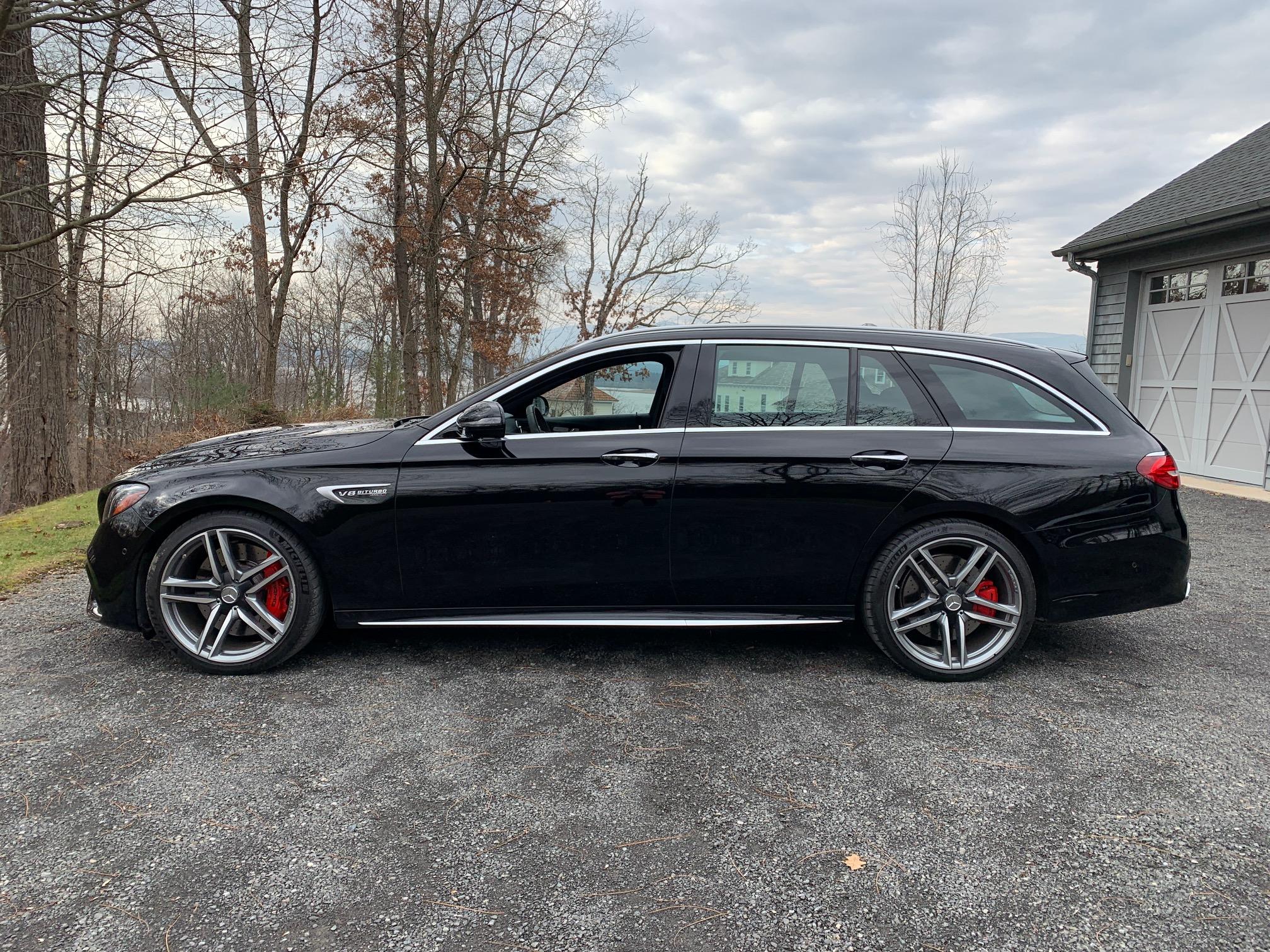 Staggered-width 20″ AMG wheels with grey accents are wrapped in Michelin PilotSport 4 S tires that measure 265/35 up front and 295/30 in back. The car is equipped with Air Body Control suspension and red-finished brake calipers with cross-drilled rotors. The rear tires were replaced in August 2021.