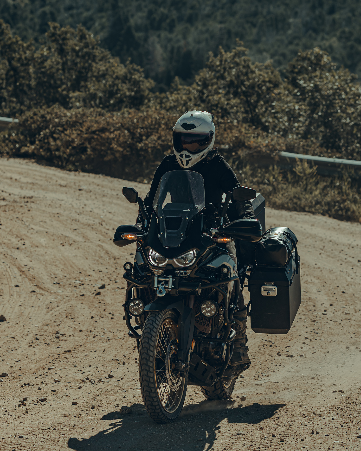 The wire-spoke wheels feature gold rims and are mounted with 90/90-21 front and 150/70R18 rear Heidenau K 60 Scout tires that were replaced by Overland Expo after the provided photos were taken. The front suspension features a 45mm inverted fork with 9.1″ of travel, while the rear features a single shock offering 8.7″ of travel. The Africa Twin features a lean-sensitive ABS system. An AltRider DualControl brake controller was fitted by Overland Expo, and stopping power is provided by dual Nissin four-piston hydraulic calipers over 310mm cross-drilled rotors up front, and a single-piston rear unit over a 256mm rotor. A Superwinch winch is fitted up front.