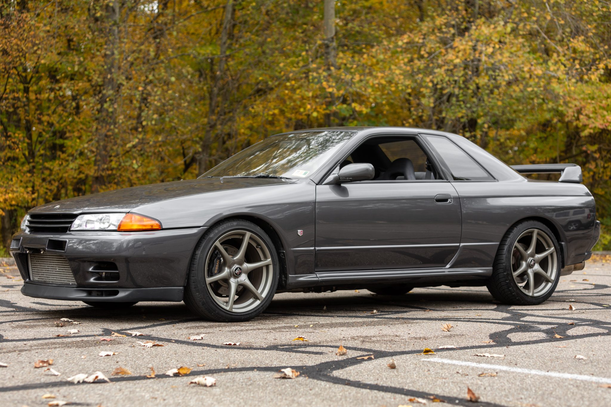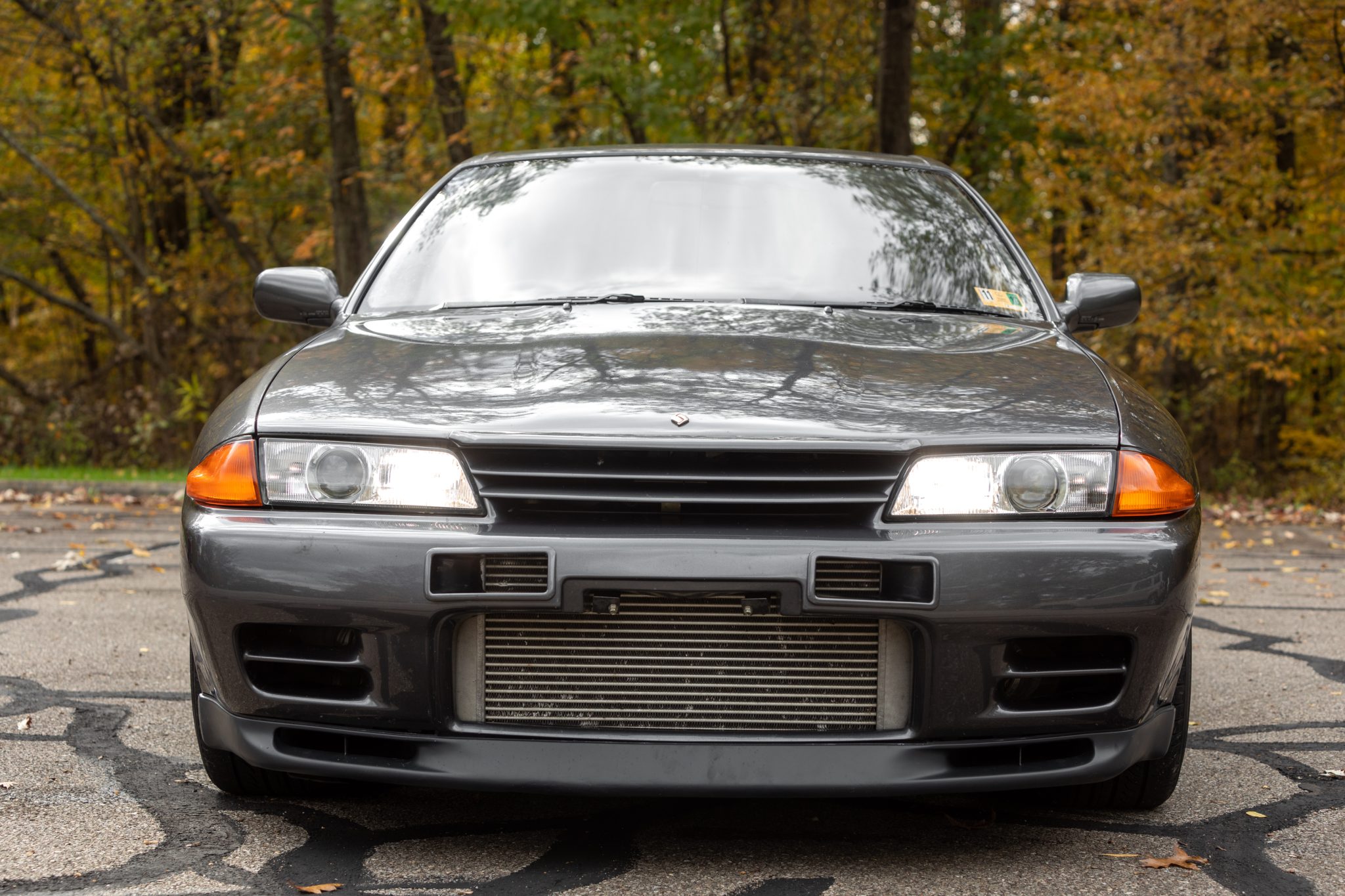 Replacement R34 GT-R 18″ alloy wheels are finished in dark gray and mounted with 245/40 BFGoodrich g-Force Comp 2 A/S and Bridgestone Regno tires that show date codes from 2019 and 2007, respectively. The R32 GT-R features Super HICAS four-wheel steering, and braking is handled by four-wheel cross-drilled rotors with gray Nissan-branded calipers and ABS.
