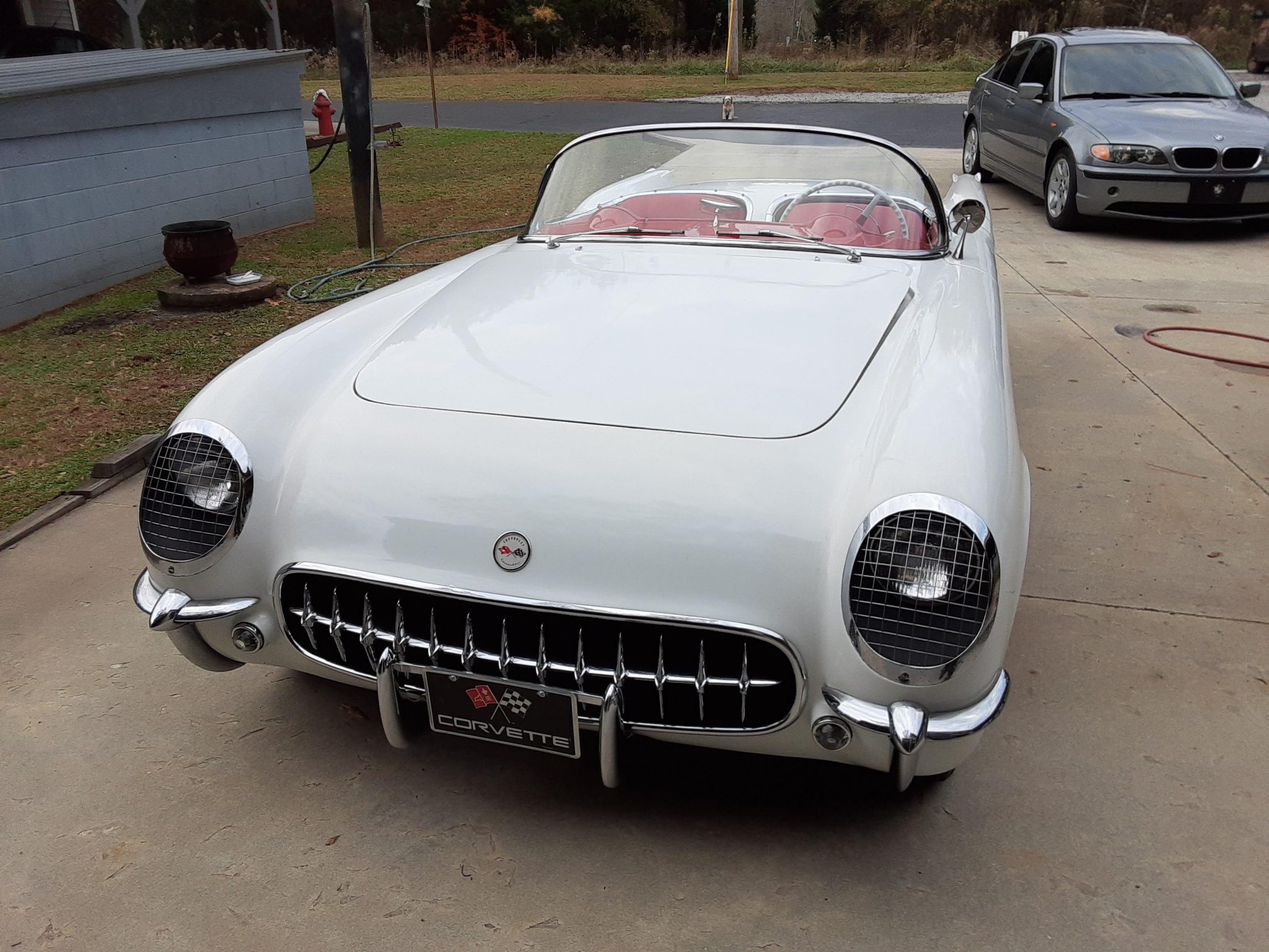 Red-painted 15” steel wheels feature polished covers and are mounted with BFGoodrich Silvertown whitewall tires. The seller states that the four-wheel drum brakes were refreshed, the emergency brake cable was replaced, and air shocks were installed out back.