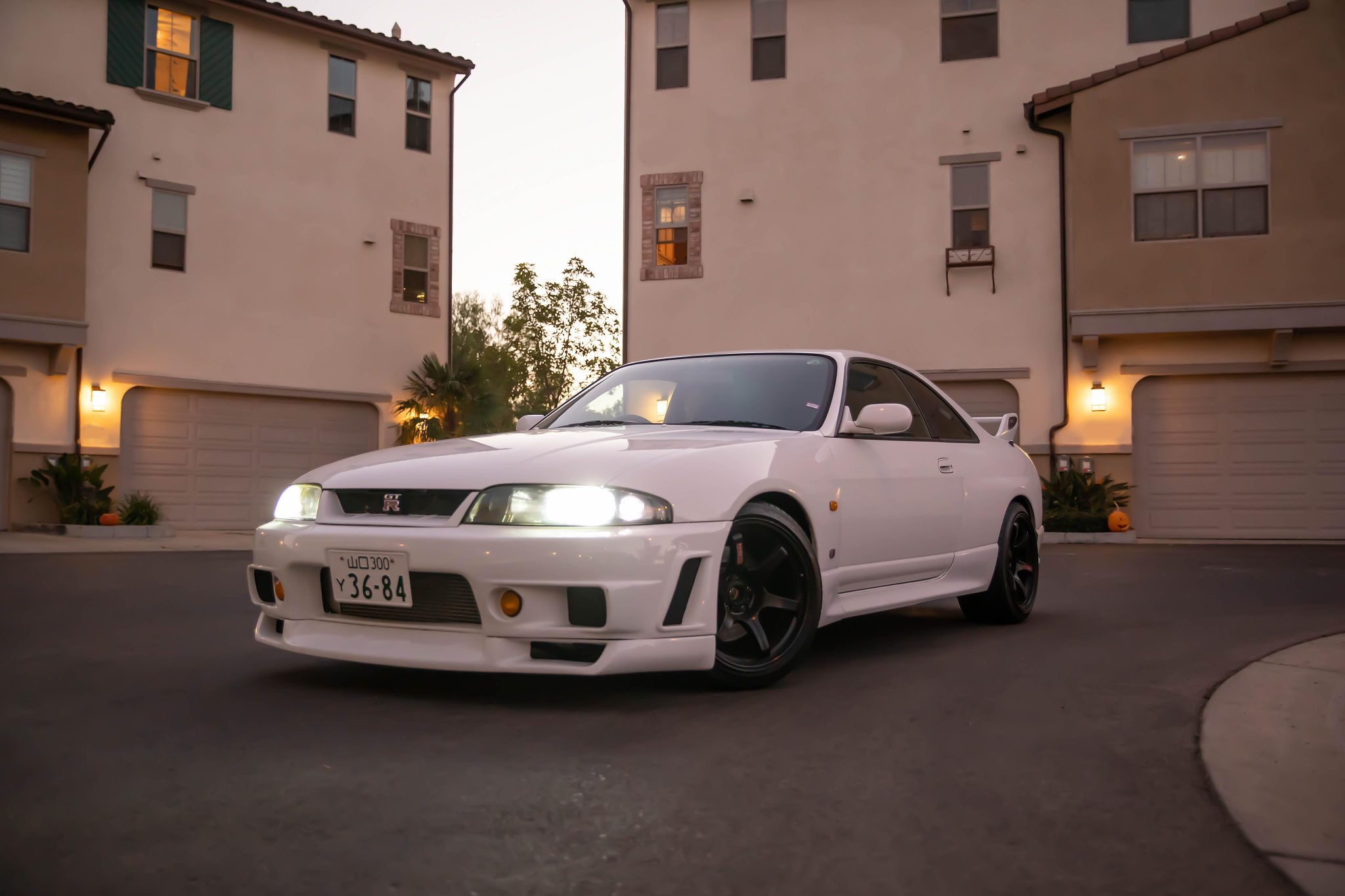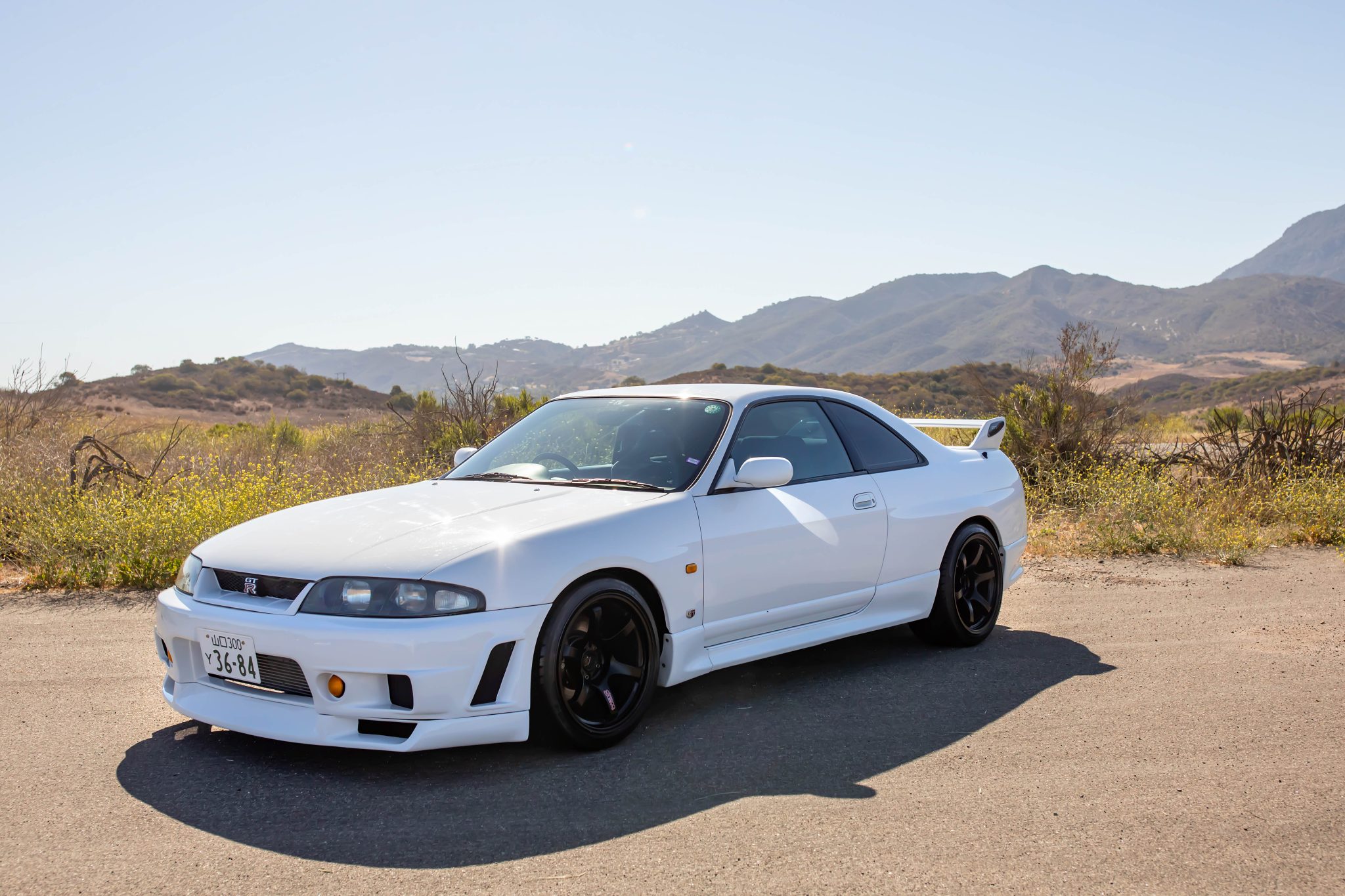 Satin black-finished 18″ Rays Gram Lights alloy wheels are wrapped in 265/35 Nankang Ultra Sport NS-II tires. The car is equipped with Super-HICAS four-wheel steering, Brembo disc brakes, front and rear strut tower braces, and aftermarket height-adjustable coilovers.