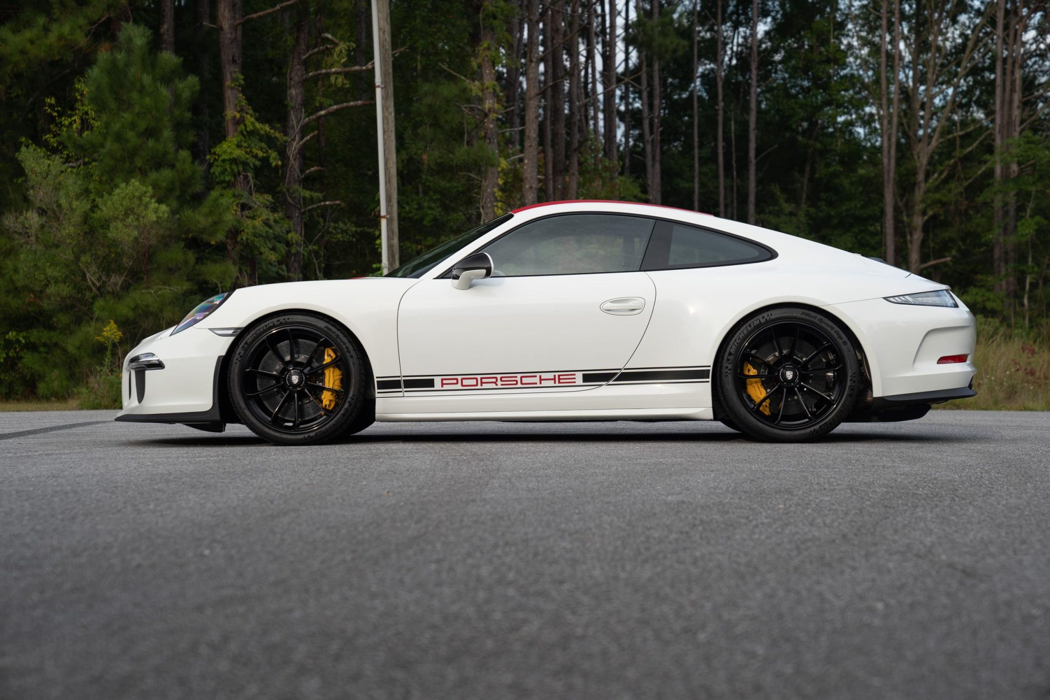 Exterior equipment includes body-color side skirts, Sport Design mirrors with carbon-fiber caps, a speed-activated rear spoiler, automatically dimming mirrors, a rain sensor, the Dynamic Light System with LED headlights in black housings, and clear taillight lenses. A Nürburgring decal has been applied to the rear bumper.